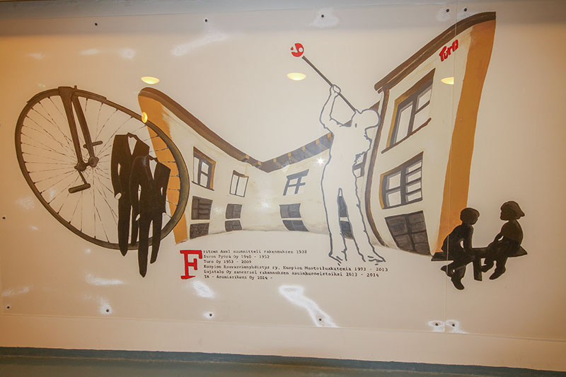 Käytävään on tehty talon historiasta kertova maalaus.