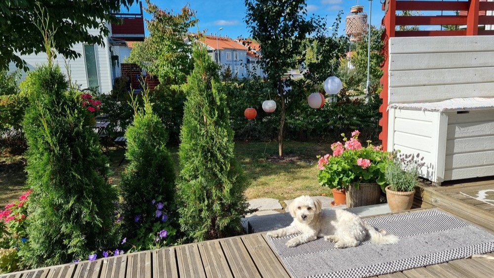 – Kodissamme riittää luonnonvaloa, sillä keittiö ja olohuone avautuvat kolmeen ilmansuuntaan. Puutarhaihmisenä onnenpaikkani on kookas pihamme, johon olen istuttanut kukkia ja perennoja. Siellä on myös yksi kotimme tärkeimmistä elementeistä: rakennuttamani pihamaja.