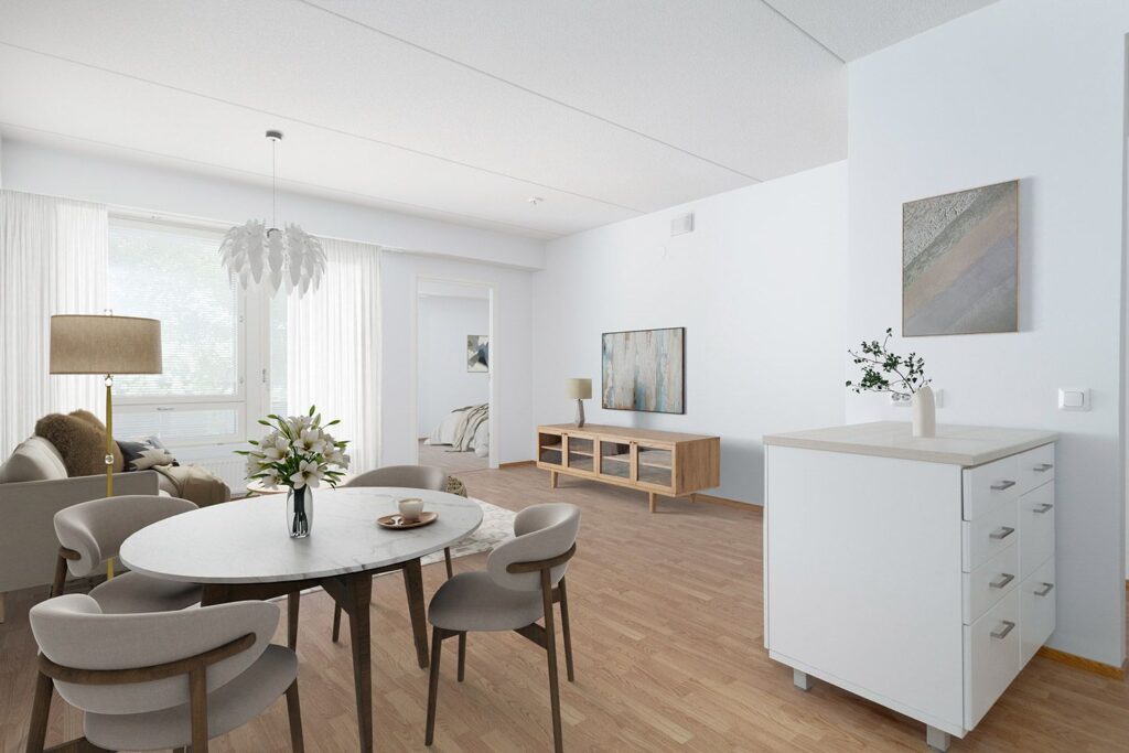 Tässä pohjakerroksen tilavassa kaksiossa yhdistyvät käytännöllisyys ja mukavuus. Avokeittiö avautuu suoraan olohuoneeseen, mikä luo ilmavan ja avoimen tunnelman. Makuuhuone on sopivan kokoinen ja sieltä löytyy hyvät säilytystilat. Tilava kylpyhuone omalla saunalla tekee arjesta entistä mukavampaa. Tämä koti on loistava valinta, jos etsit avaraa ja helposti asuttavaa tilaa rauhallisella sijainnilla.