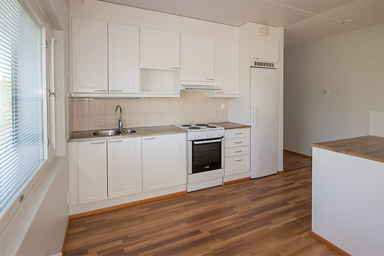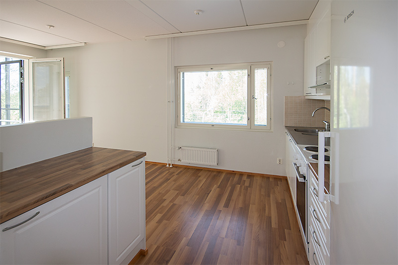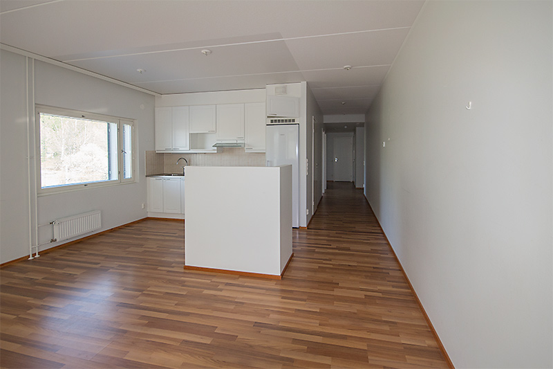 Avara olohuone ja avokeittiö muodostavat viihtyisän kokonaisuuden. Keittiössä on näppärä pieni saareke, joka tuo lisää työskentely- ja säilytystilaa. Asunnossa on poikkeuksellisen runsaasti säilytystilaa kahden vaatehuoneen ansiosta, ja arjen sujuvuutta lisää erillinen wc.