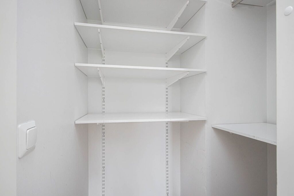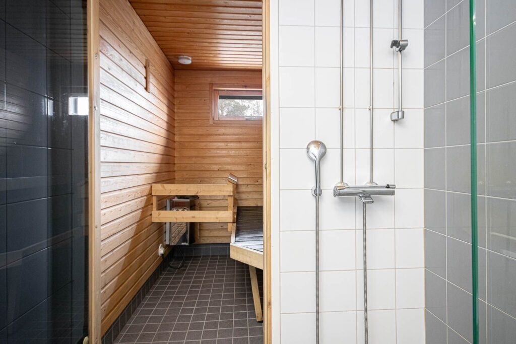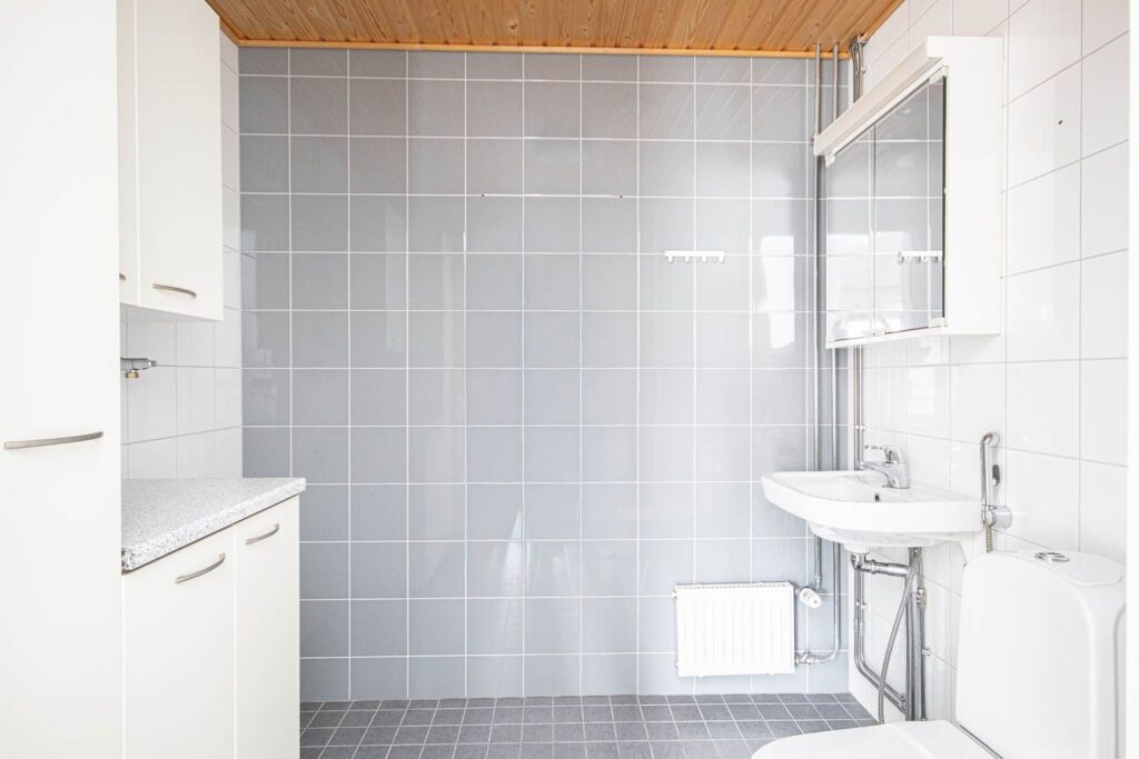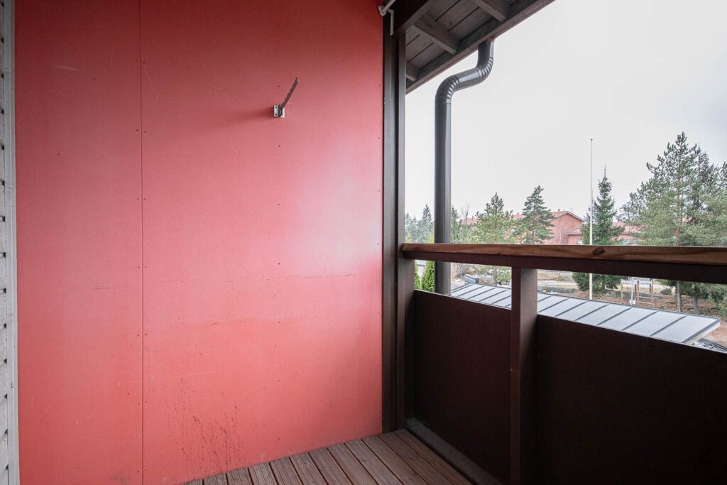 Jykevät betoniportaat vievät yläkertaan, jossa on makuuhuoneet ja kylpyhuone. Yhdestä makuuhuoneesta on käynti parvekkeelle. Kylpyhuoneessa on laatoitetut lattiat, ja asumismukavuutta lisää oma sauna. Asuintilojen lattiat ovat parkettia. Seinät on juuri maalattu valkoisiksi.