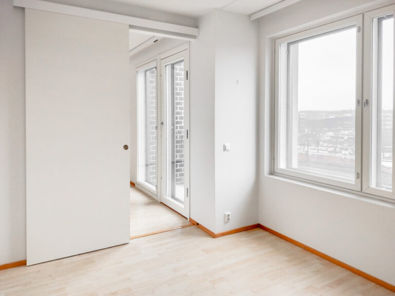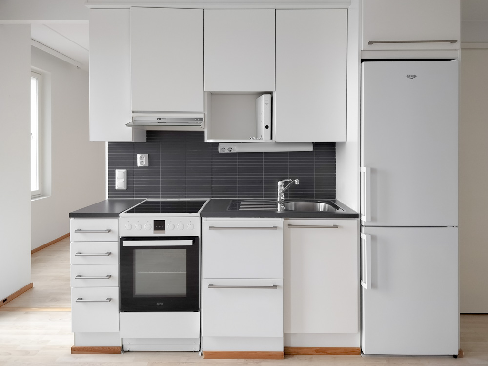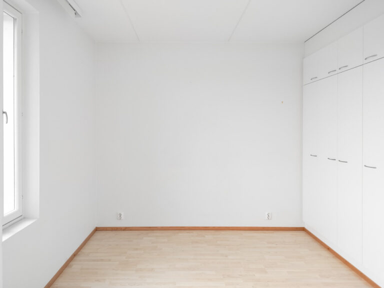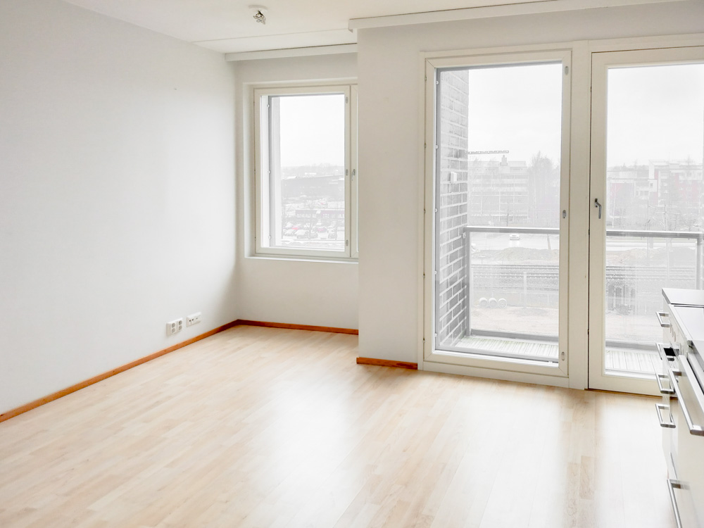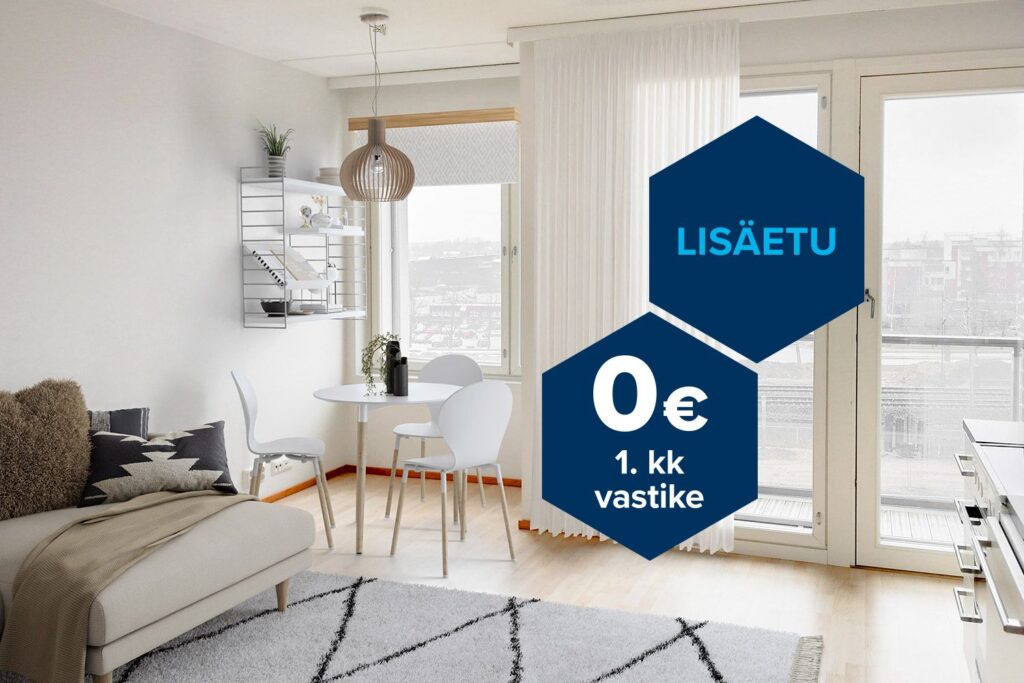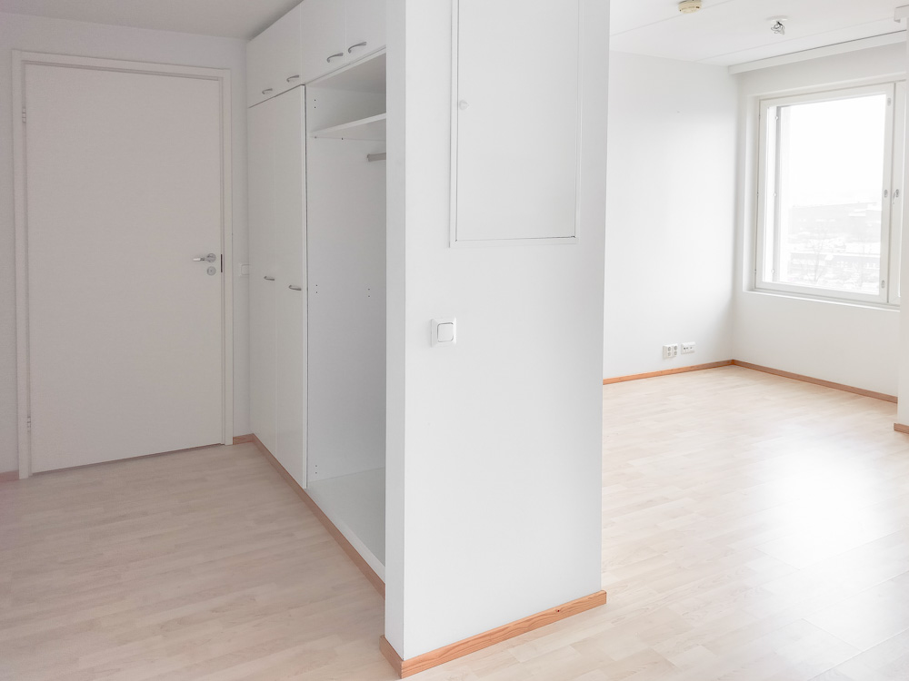 Ylimmän kerroksen kompakti vaaleasävyinen asunto erillisellä makuuhuoneella. Asunnossa on avokeittiö, pieni parveke ja näkymät asunnosta ovat avarat. Säilytystilaa on mukavasti eteisessä ja makuuhuoneessa. Kylpyhuone on tilava, ja sen kruunaa oma sauna. Keittiössä on tilavaraus astianpesukoneelle ja kylpyhuoneessa puolestaan pyykinpesukoneelle. Asukkaiden käytössä on myös talopesula.