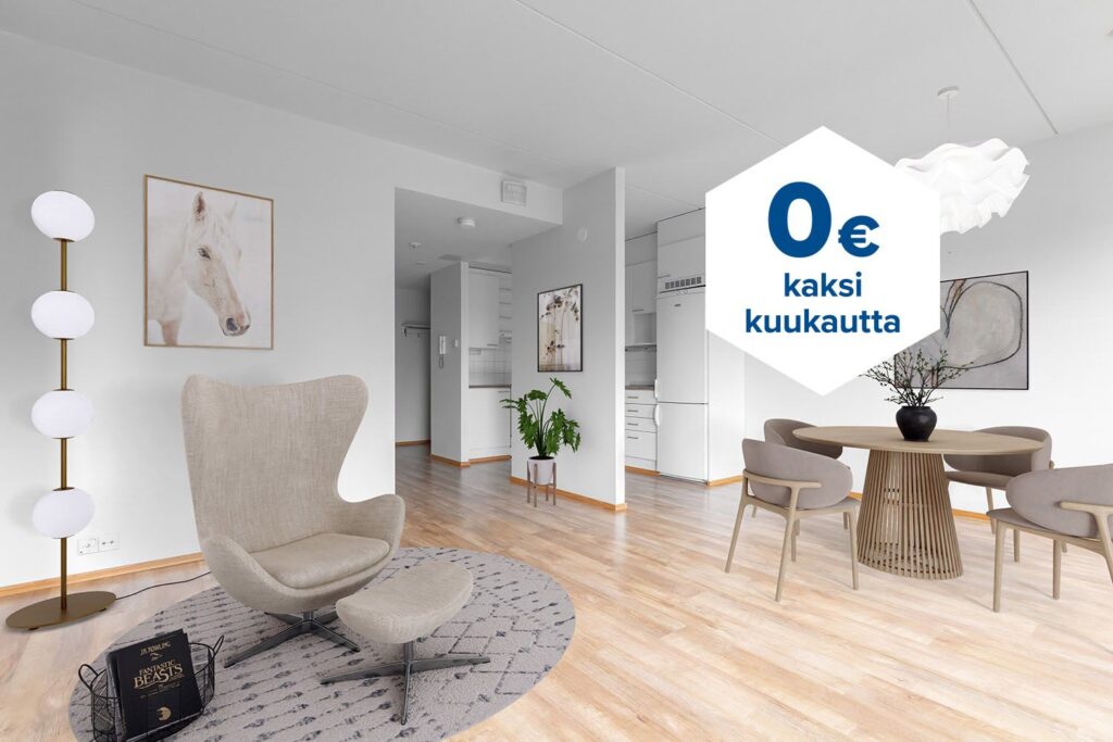 Tee sopimus nyt – saat kahden ensimmäisen kuukauden käyttövastikkeen hintaan 0 € ja vakuusmaksun 250 €. Edut ovat voimassa 15.4.2026 saakka ja koskevat vain uusia asiakkaita. Vesi- ja autopaikkamaksut normaalisti. Edellyttää 12 kuukauden asumista.