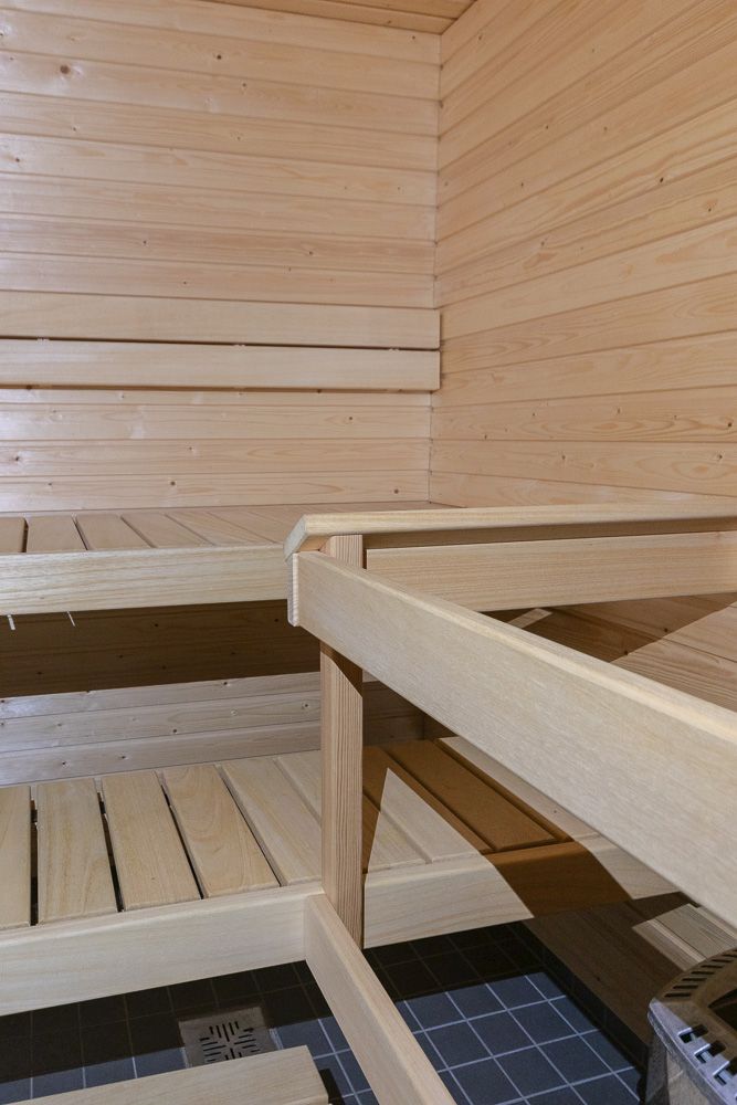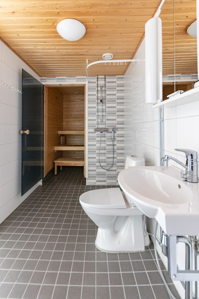 Iso kylpyhuone ja oma sauna tuovat arkeen ripauksen ylellisyyttä ja kaappitilaa on runsaasti – säilytysratkaisut on mietitty käytännöllisyyttä unohtamatta.