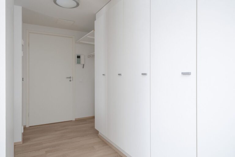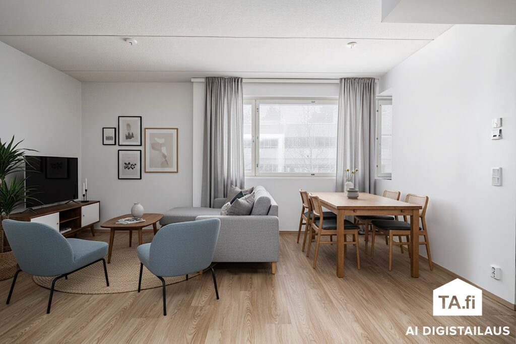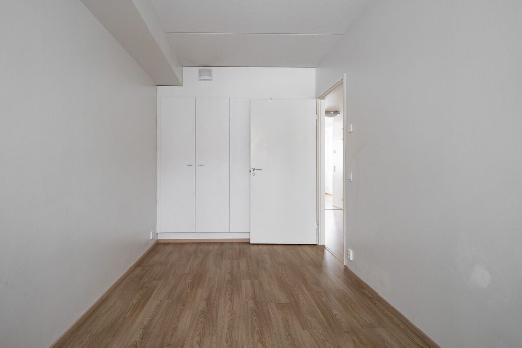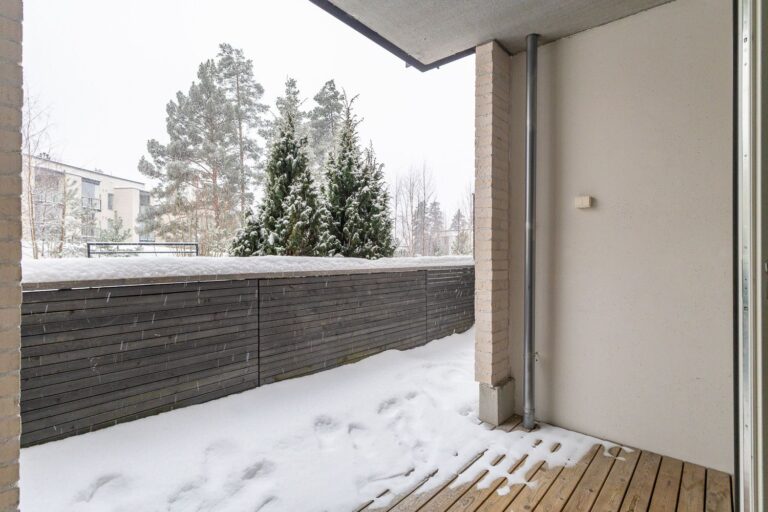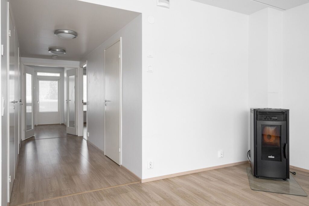 Asunnossa on modernit, vaaleat pinnat ja pellettitakka olohuoneessa luomassa tunnelmaa. Säilytystilaa on mukavasti: kaapistot eteisessä ja makuuhuoneissa sekä vaatehuone. Toisesta makuuhuoneesta on käynti asunnon laudoitetulle terassille.