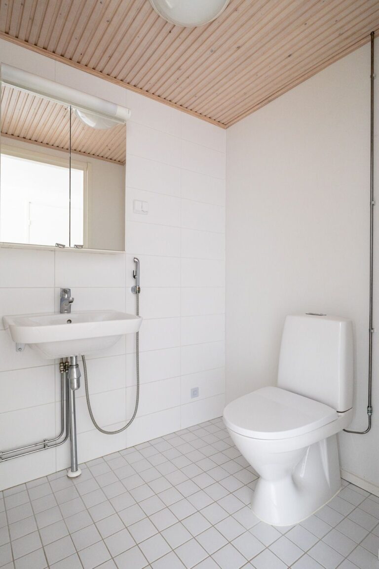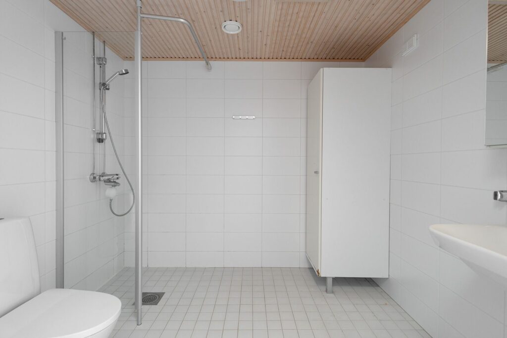 Selkeä ja toimiva kylpyhuone on varustettu peilikaapilla ja suihkuseinällä. Asunnossa on lisäksi erillinen wc. Pyykinpesukoneelle ja kuivausrummulle on tilavaraus ja liitännät kylpyhuoneessa. Voit halutessasi varata saunavuoron viihtyisästä talosaunasta.