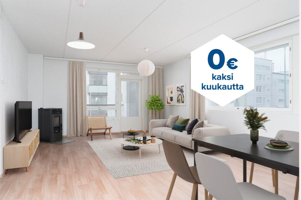 Tee sopimus nyt – saat kahden ensimmäisen kuukauden käyttövastikkeen hintaan 0 € ja vakuusmaksun 250 €. Edut ovat voimassa 15.4.2026 saakka ja koskevat vain vapaita asuntoja ja uusia asiakkaita. Vesi- ja autopaikkamaksut normaalisti. Edellyttää 12 kuukauden asumista.