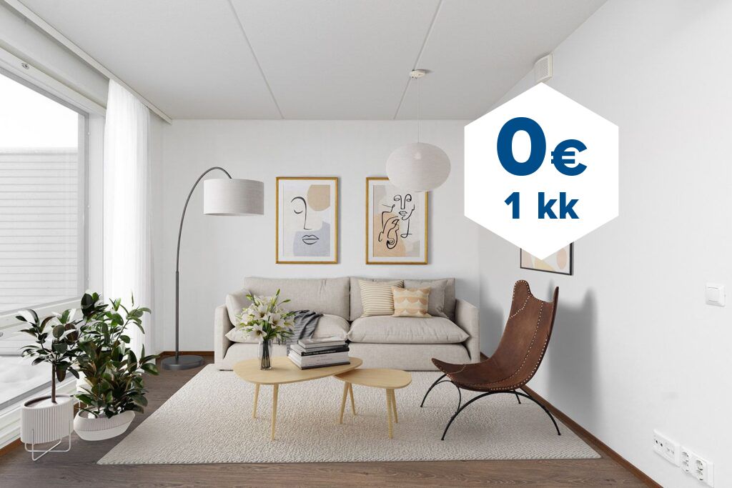 Tee sopimus nyt – saat ensimmäisen kuukauden käyttövastikkeen hintaan 0 €. Etu on voimassa 15.4.2026 saakka ja koskee vain vapaita asuntoja ja uusia asiakkaita. Vesi- ja autopaikkamaksut normaalisti.