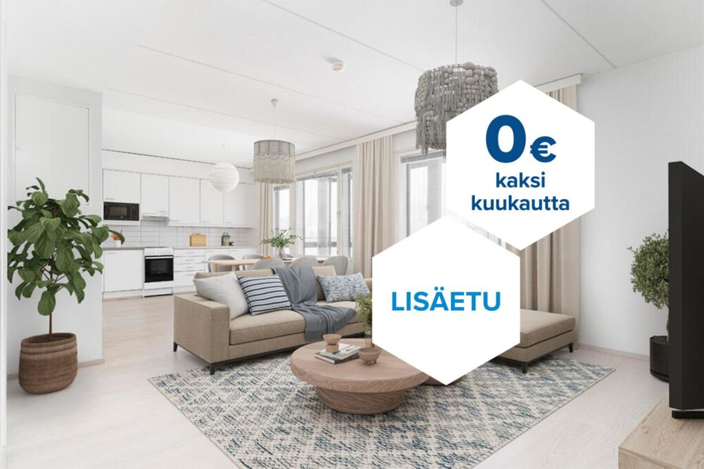 Tee sopimus nyt – saat kahden ensimmäisen kuukauden käyttövastikkeen hintaan 0 € ja vakuusmaksun 250 €. Edut ovat voimassa 15.4.2026 saakka ja koskevat vain uusia asiakkaita. Vesi- ja autopaikkamaksut normaalisti. Edellyttää 12 kuukauden asumista.