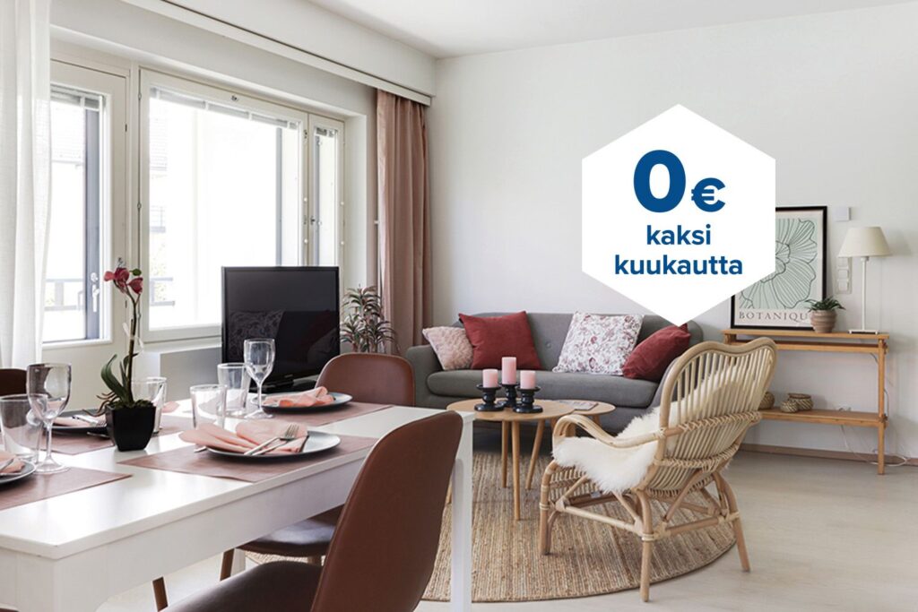 Tee sopimus nyt – saat kahden ensimmäisen kuukauden käyttövastikkeen hintaan 0 € ja vakuusmaksun 250 €. Edut ovat voimassa 15.4.2026 saakka ja koskevat vain uusia asiakkaita. Vesi- ja autopaikkamaksut normaalisti. Edellyttää 12 kuukauden asumista.