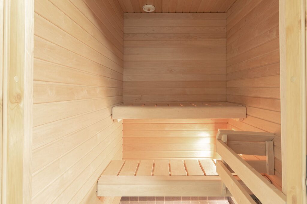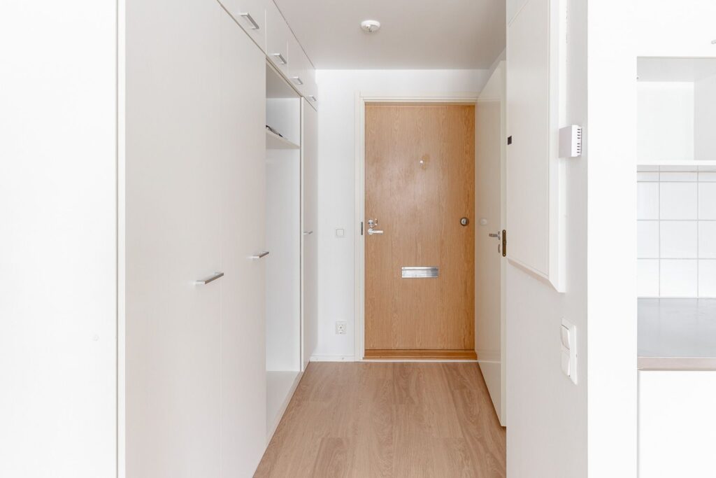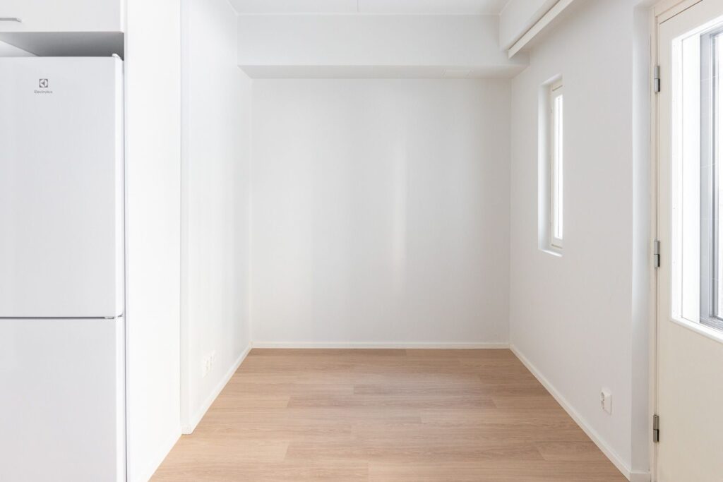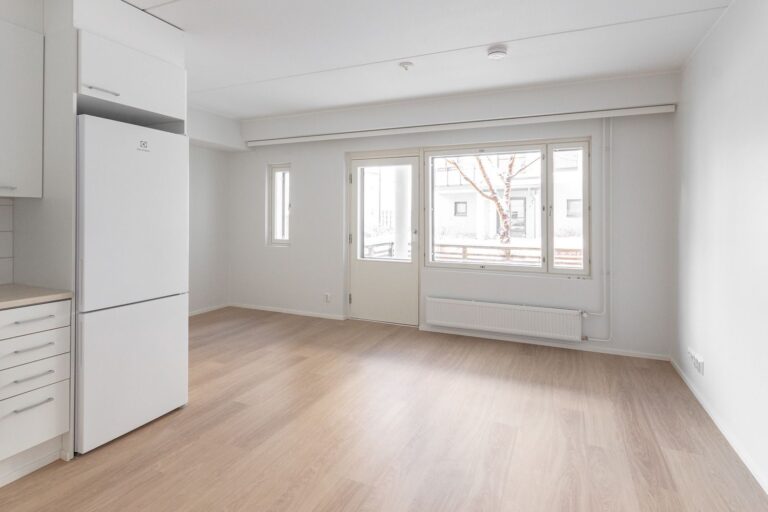 Ensimmäisen kerroksen vaaleasävyinen tehoyksiö vapaana. Alkovissa tilaa parisängylle ja säilytystilaa löytyy eteisen kaapistoista. Oma sauna lämpenee aina halutessasi ja vilvoittelemaan pääset pienelle terassialueelle.