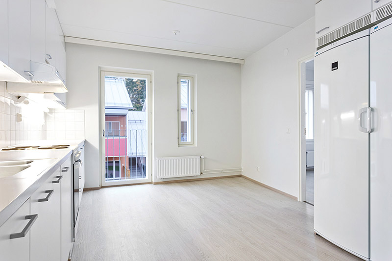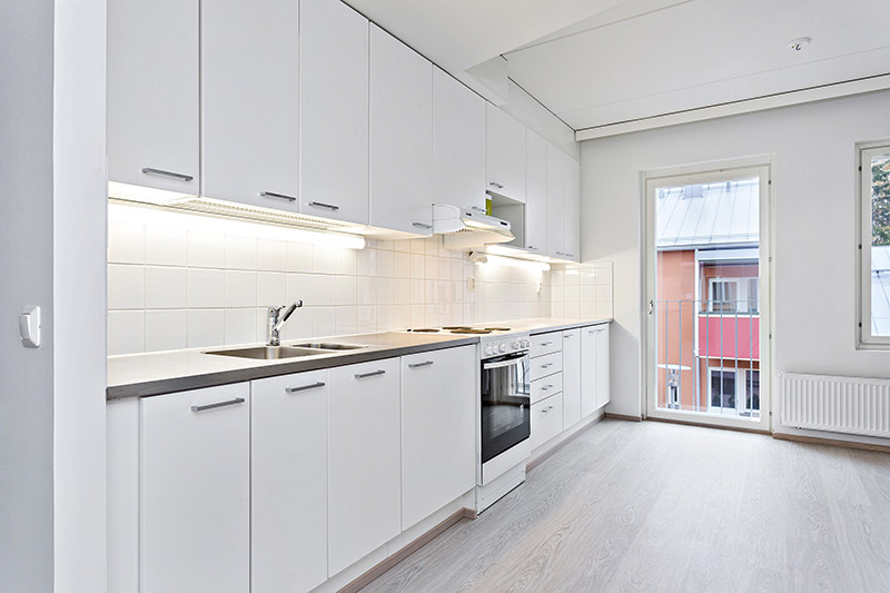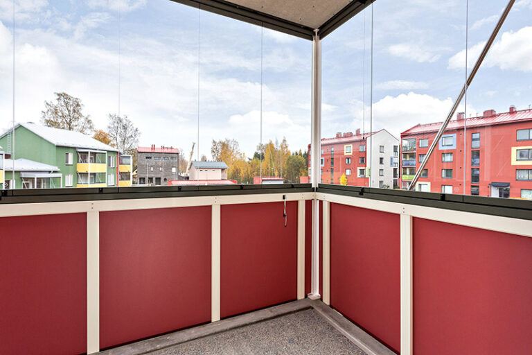 Erillinen keittiö tarjoaa hyvin työ- ja säilytystilaa sekä paikan ruokapöydälle. Keittiö avautuu olohuoneeseen ja luo kodikkaan kokonaisuuden. Olohuoneesta on käynti lasitetulle parvekkeelle, joka tuo lisätilaa oleskeluun. Lisäksi keittiössä on ranskalainen parveke.