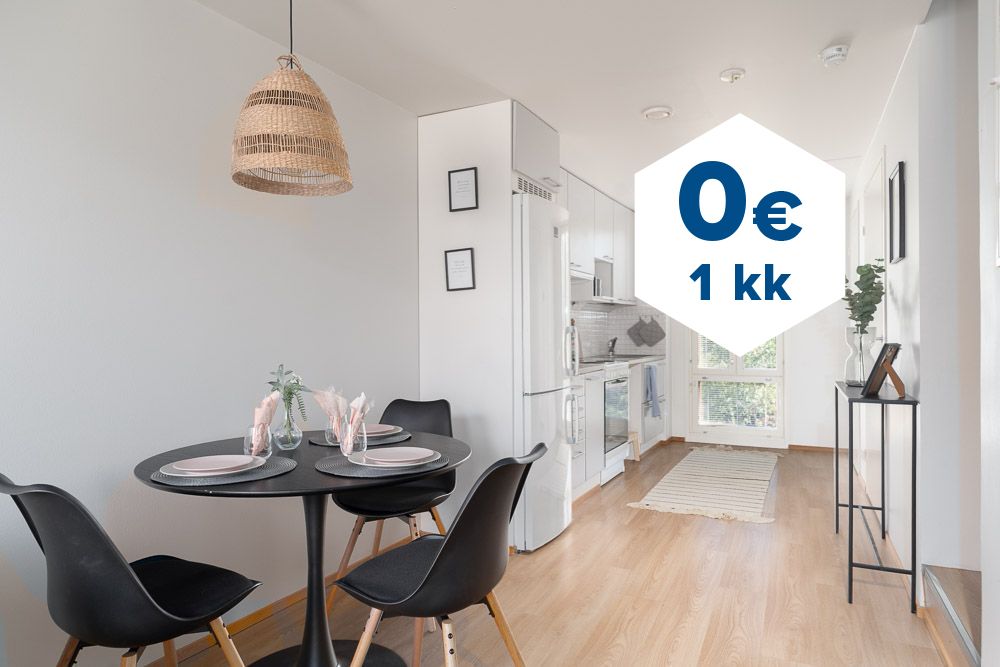 Tee sopimus nyt – saat ensimmäisen kuukauden käyttövastikkeen hintaan 0 €. Etu on voimassa 15.4.2026 saakka ja koskee vain vapaita asuntoja ja uusia asiakkaita. Vesi- ja autopaikkamaksut normaalisti.