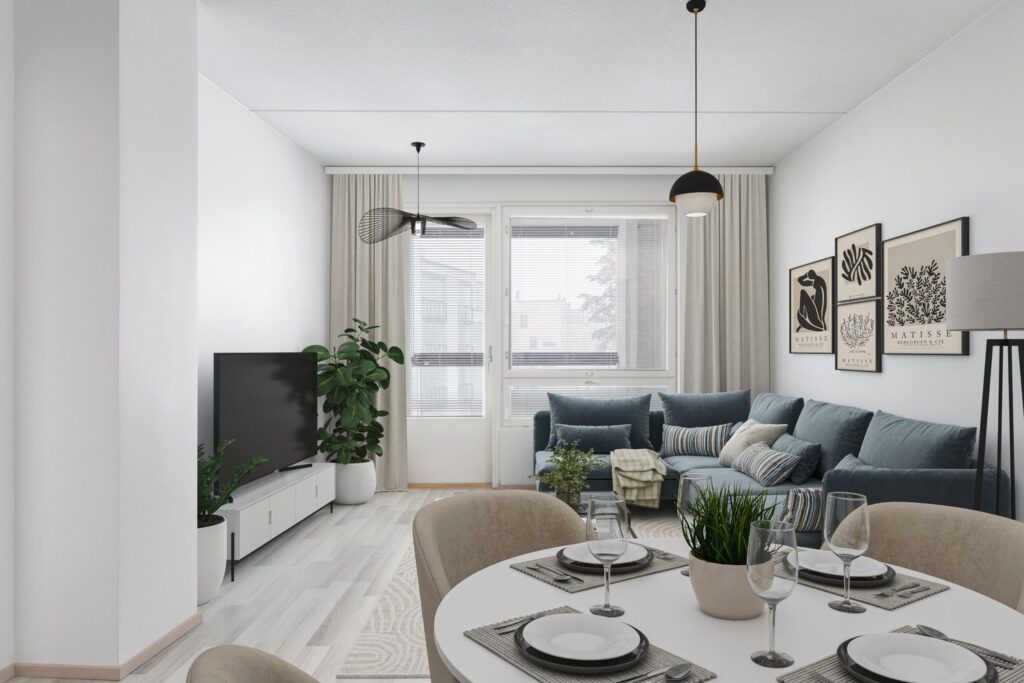 Viihtyvyyttä lisää erillinen tilava vaatehuone sekä sisäpihalle suuntaava lasitettu parveke. Olohuoneeseen tunnelmaa luo pellettitakka. Tilava keittiö avautuu olohuoneeseen, mutta on kuitenkin omassa kulmauksessaan. Keittiössä on mukavasti laskutilaa, induktioliesi, jääkaappipakastin sekä tilavaraukset astianpesukoneelle ja mikrouunille.