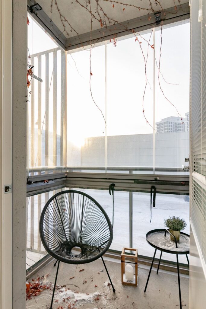 Toisen kerroksen kolmio. Olohuone ja keittiö ovat yhtenäistä, avointa tilaa. Irtainvarasto on asunnossa sisällä. Pienikokoinen, lasitettu parveke.