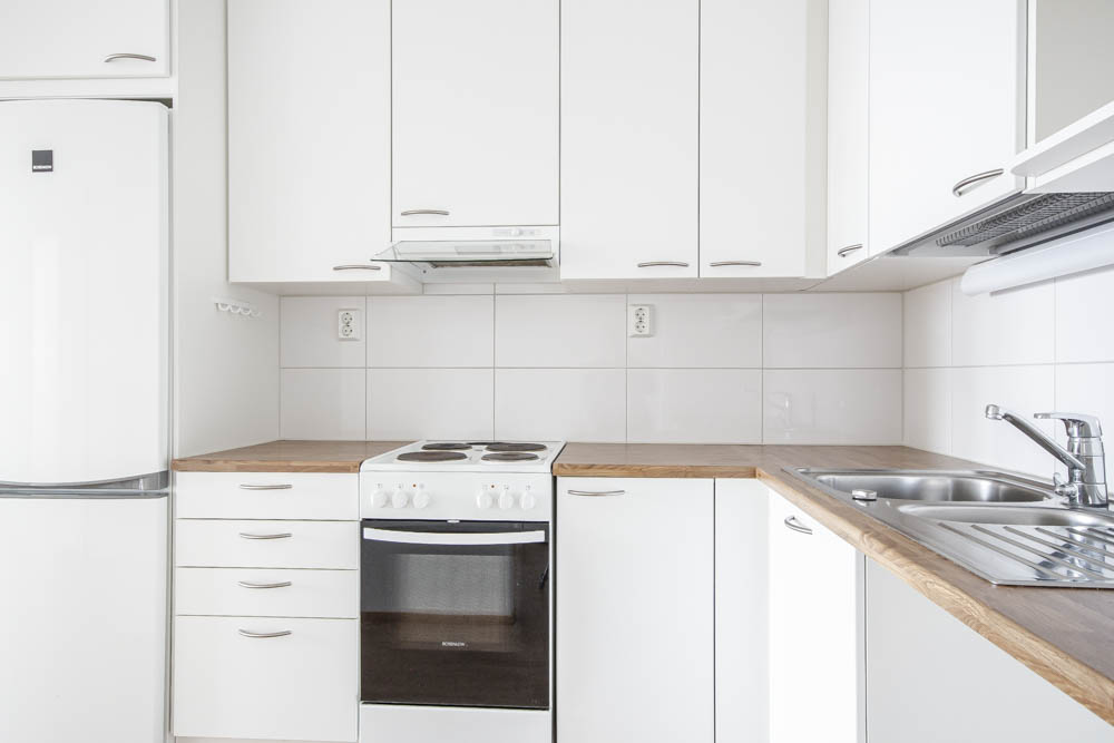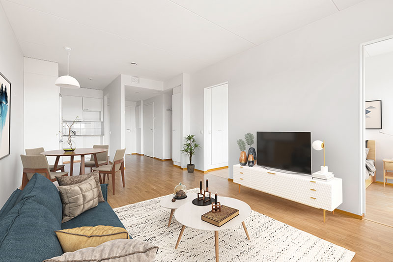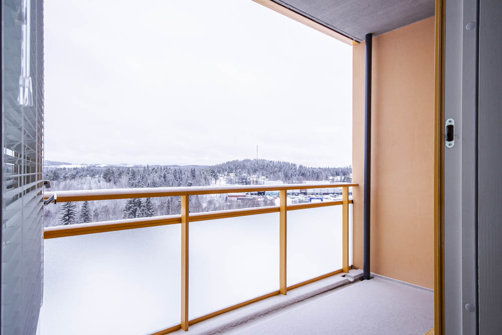 Olohuone ja ruokailutila muodostavat yhtenäisen, helposti sisustettavan kokonaisuuden. Olohuoneesta on käynti parvekkeelle, jossa on mukava nauttia aamukahvista metsäiseen maisemaan päin. Keittiötila on kompakti ja käytännöllinen, ja säilytysratkaisut tukevat arjen sujuvuutta.