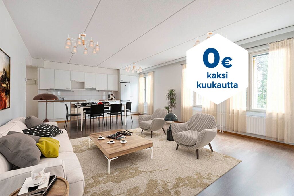 Tee sopimus nyt – saat kahden ensimmäisen kuukauden käyttövastikkeen hintaan 0 € ja vakuusmaksun 250 €. Edut ovat voimassa 15.4.2026 saakka ja koskevat vain uusia asiakkaita. Vesi- ja autopaikkamaksut normaalisti. Edellyttää 12 kuukauden asumista.