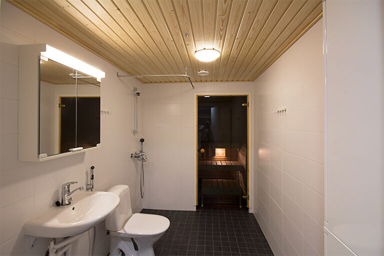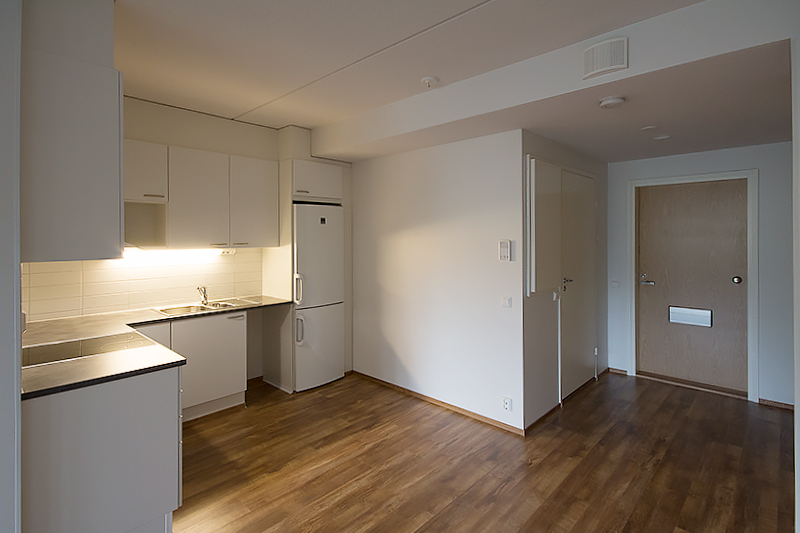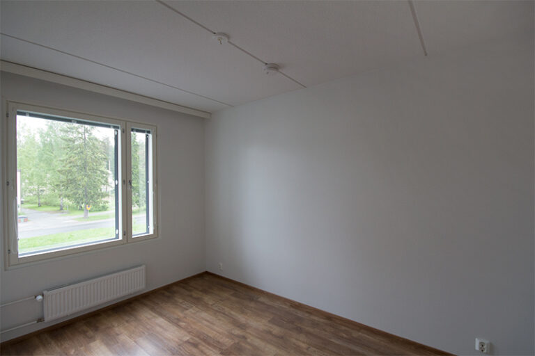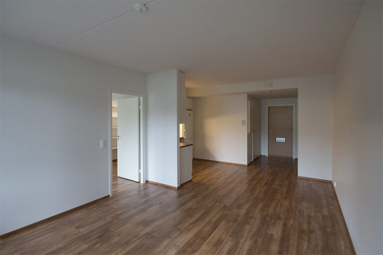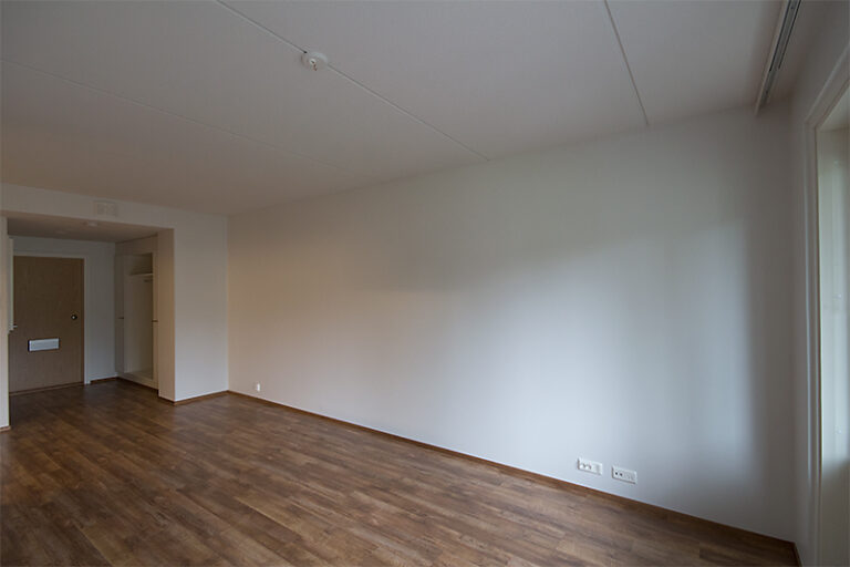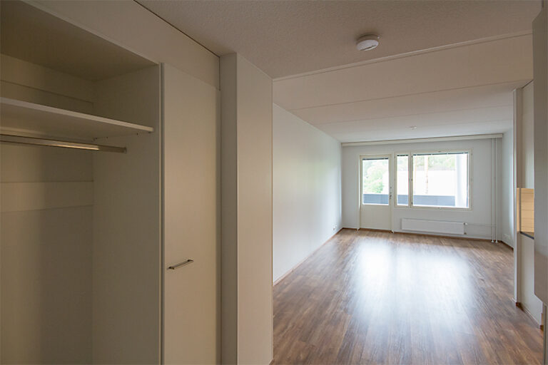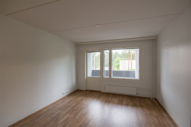 Vapautumassa ylimmän kerroksen (5/5) saunallinen kaksio. Olohuoneesta käynti luoteeseen suuntaavalle lasitetulle parvekkeelle. Sisäkuvat ovat rakennusaikaisia vastaavanlaisesta asunnosta.