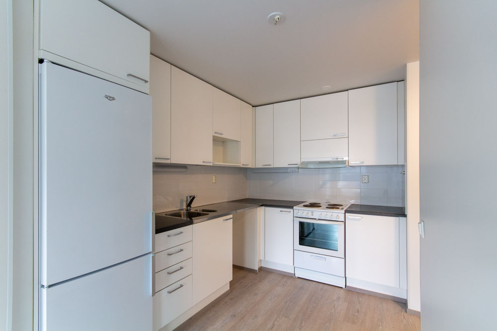 Vapautumassa alimman kerroksen (1/4) saunaton kaksio. Olohuoneesta on kulku länteen ilta-auringon puolelle suuntautuvalle lasitetulle parvekkeelle. Keittiössä on tilavaraus astianpesukoneelle ja pesutiloissa pesutornille. Pintamateriaalit ovat ajattoman tyylikkäät.