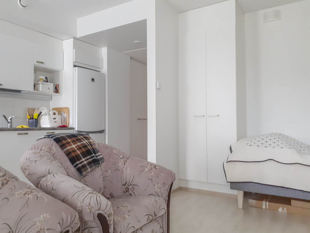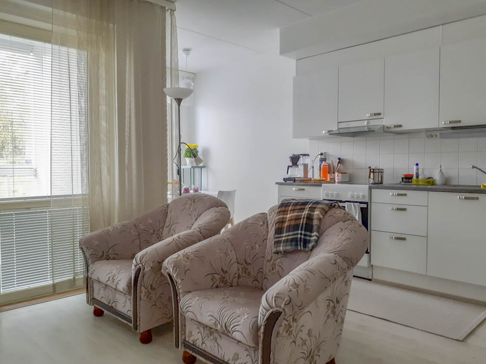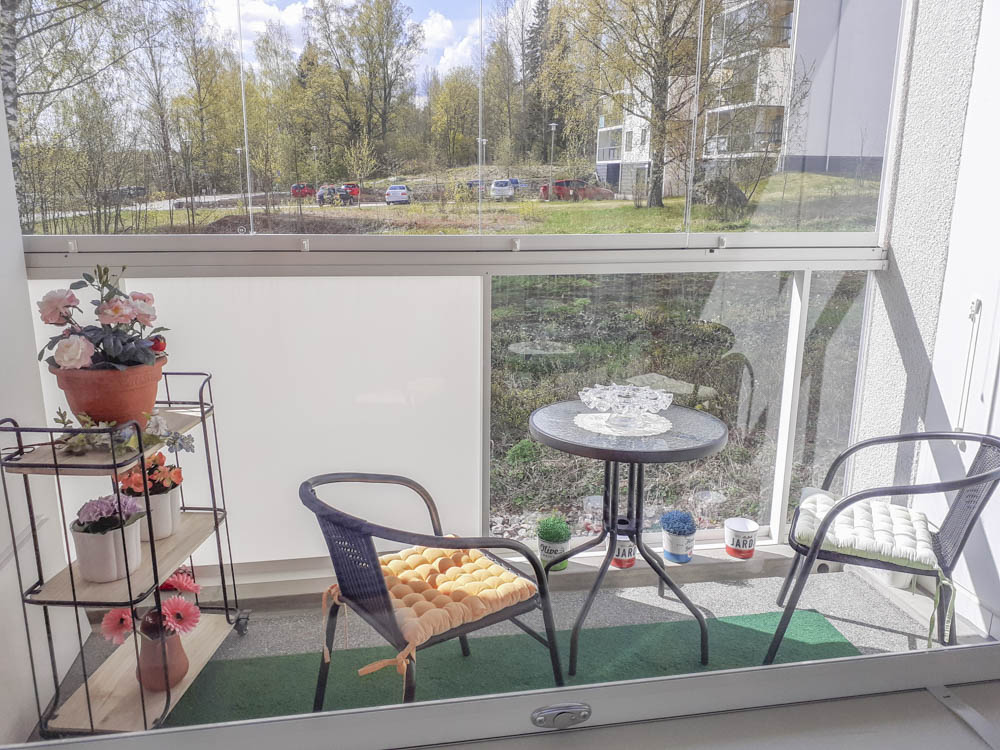 Ensimmäisen kerroksen valoisa yksiö, jonka lasitettu parveke etelän suuntaan viheralueelle päin. Ei maan tasalla.