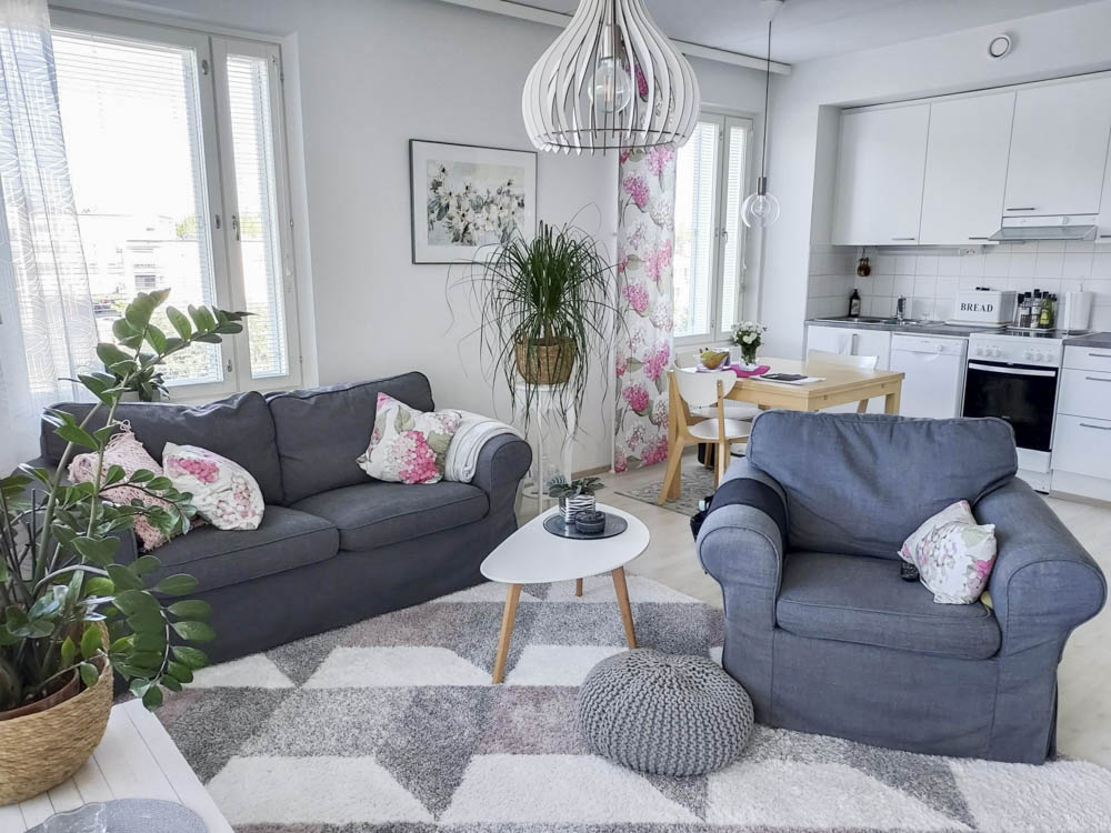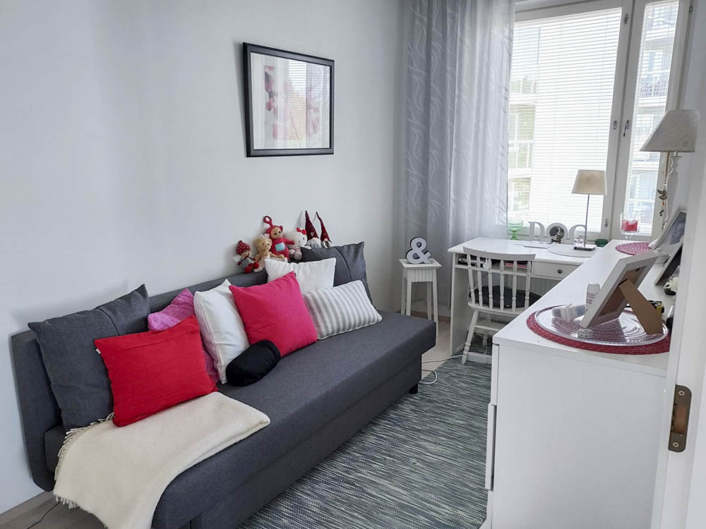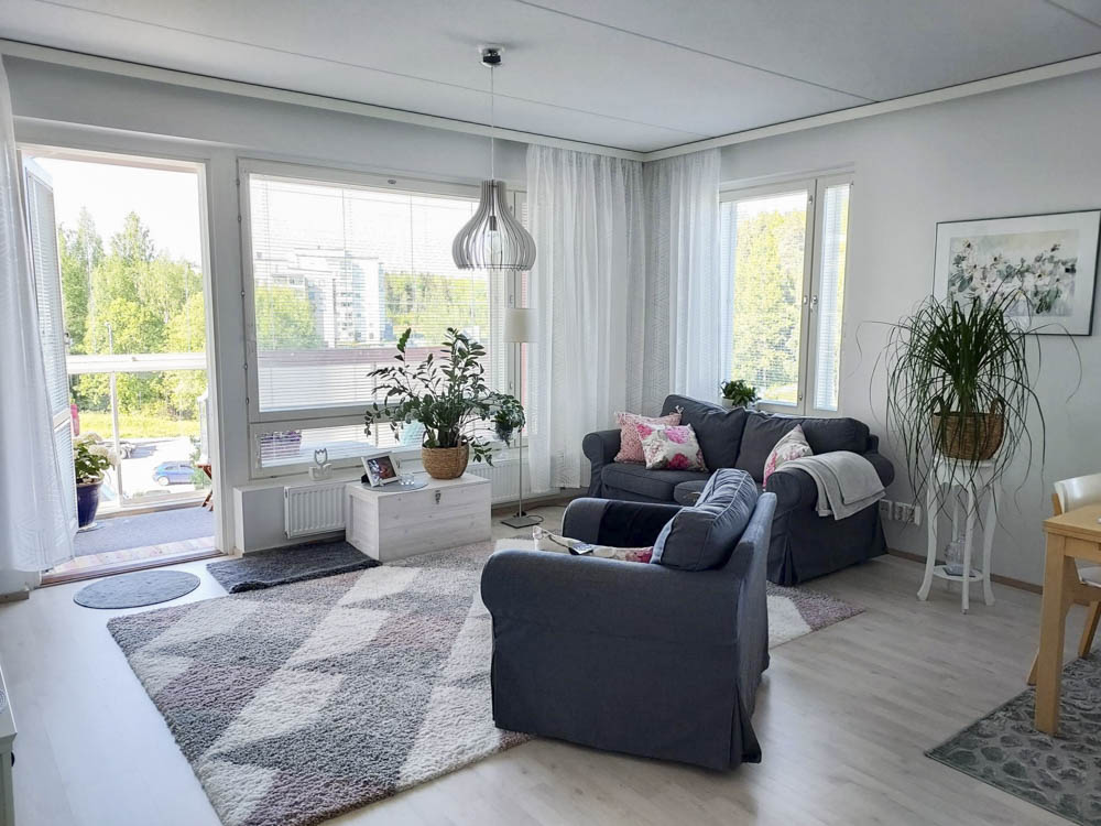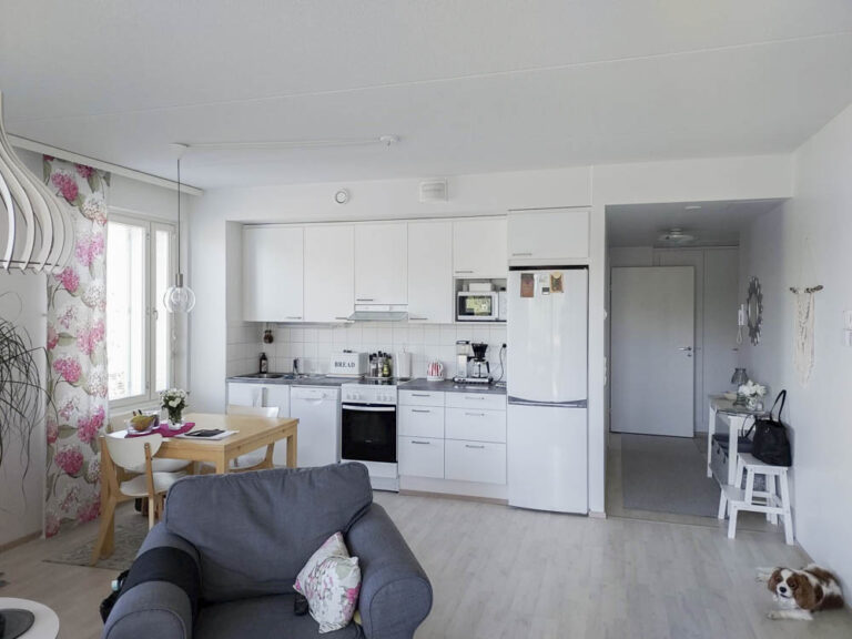 Asunto sijaitsee kolmannessa kerroksessa. Huoneistossa on vaalea laminaattilattia. Keittiössä on monisävyinen harmaa työtaso. Iso parveke tarjoaa kesällä lisää tilaa.