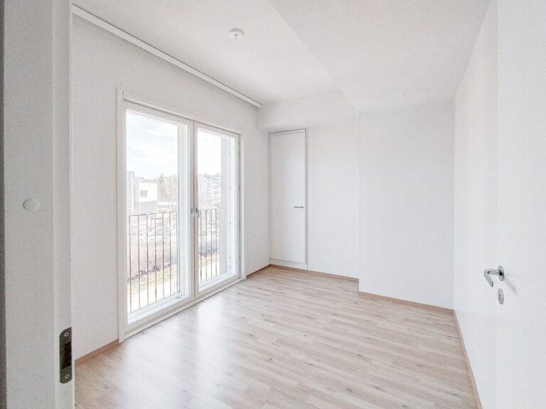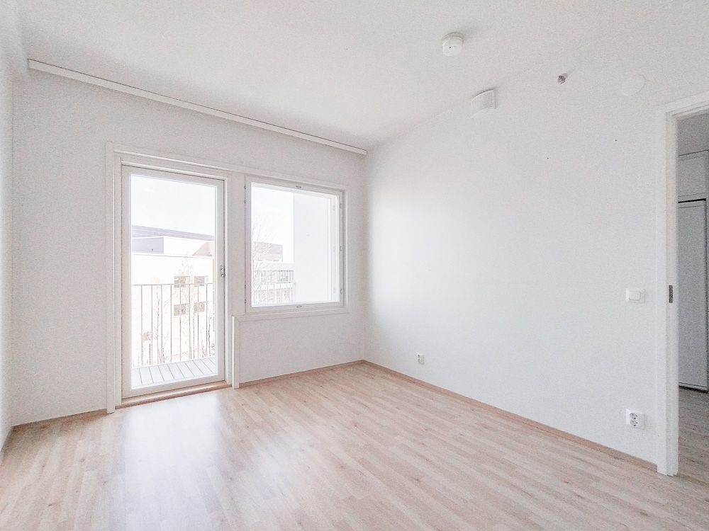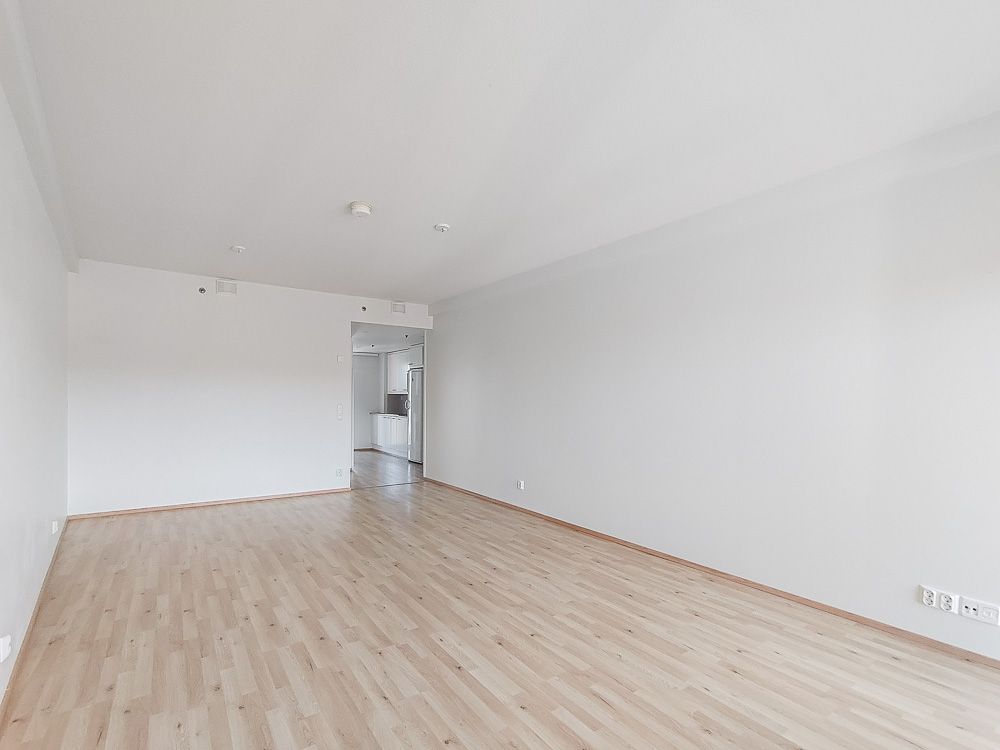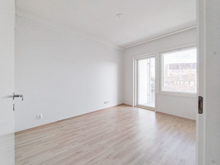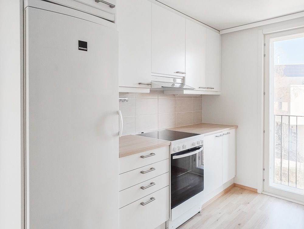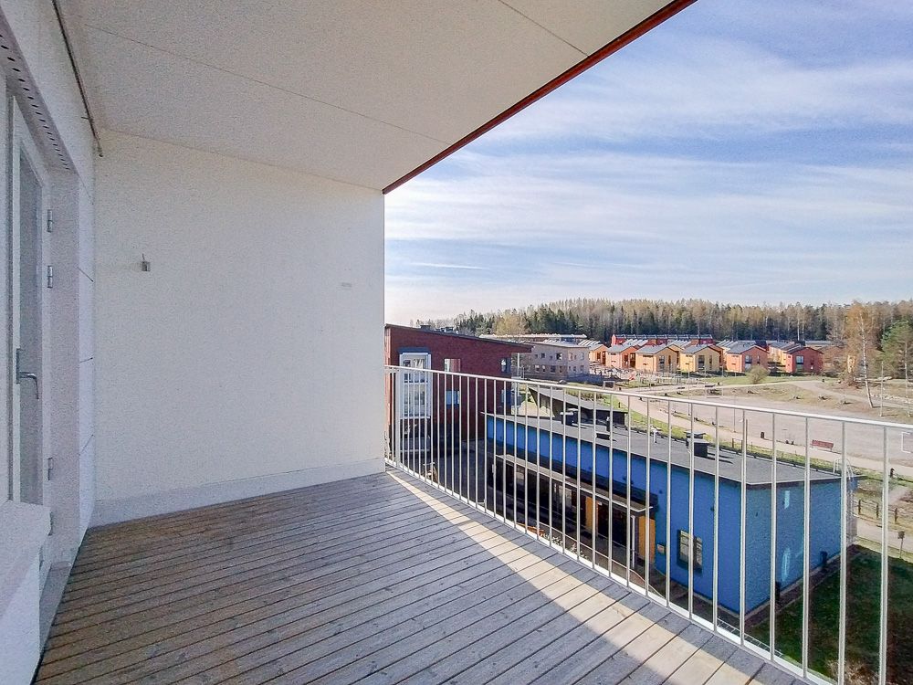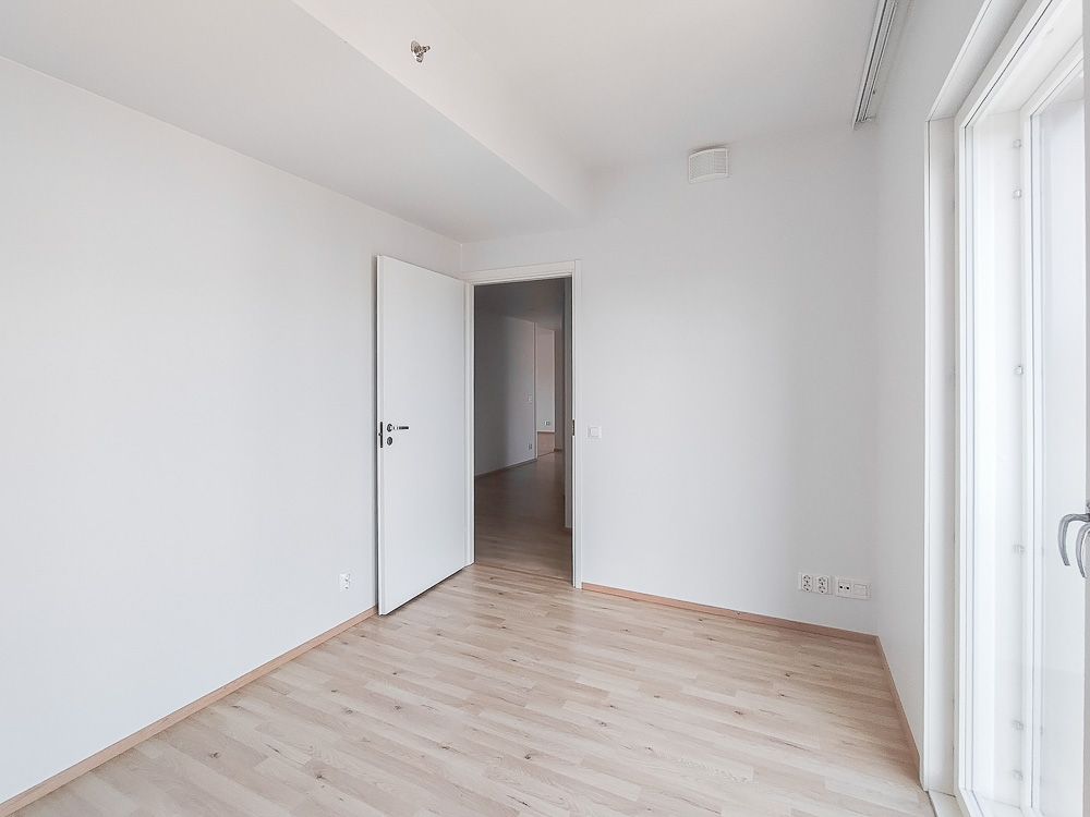 Tilava kolmio hissitalon ylimmässä kerroksessa. Tässä kodissa on kaksi parveketta. Toiselle on käynti olohuoneen puolelta ja toiselle pääsee makuuhuoneen kautta. Laatoitetussa kylpyhuoneessa on mukavasti tilaa myös pesutornille. Säilytystilaa on asunnon kaapistoissa.