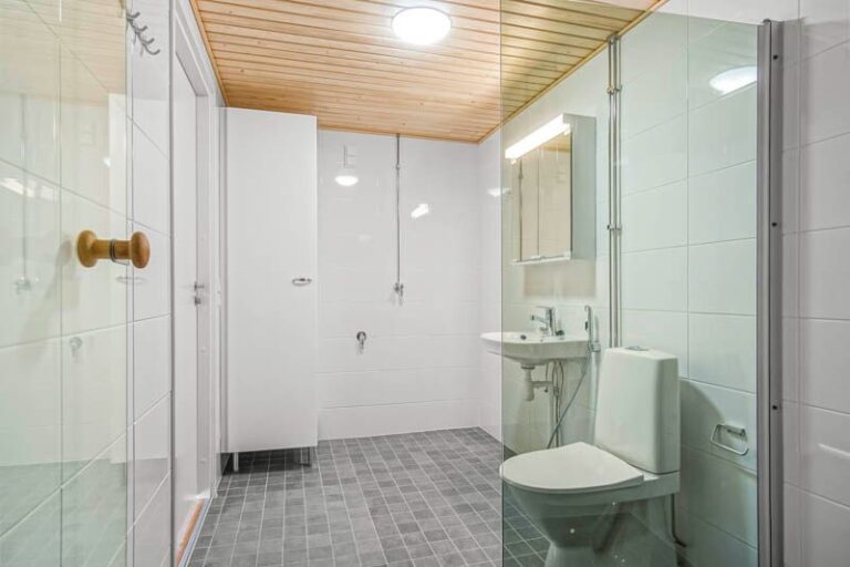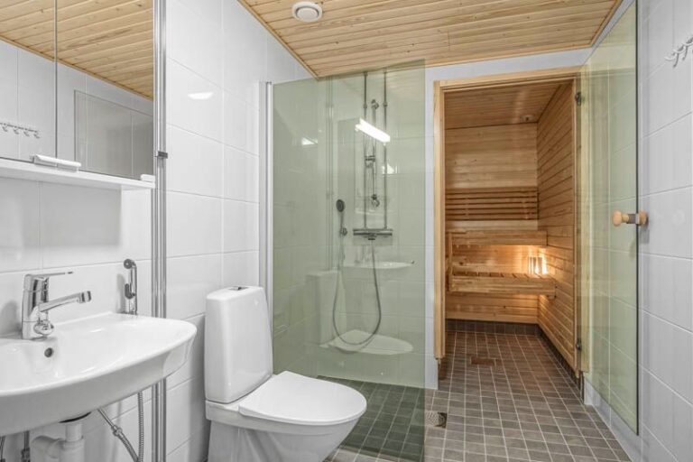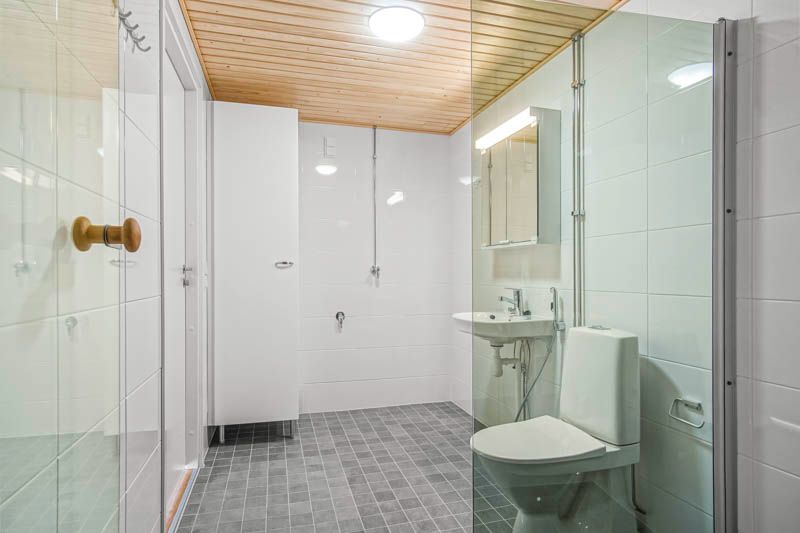 Kylpyhuoneessa on pyykkikaappi, liitännät pesukoneelle ja kuivausrummulle sekä suihku ja wc. Oma sauna kruunaa asumismukavuuden.