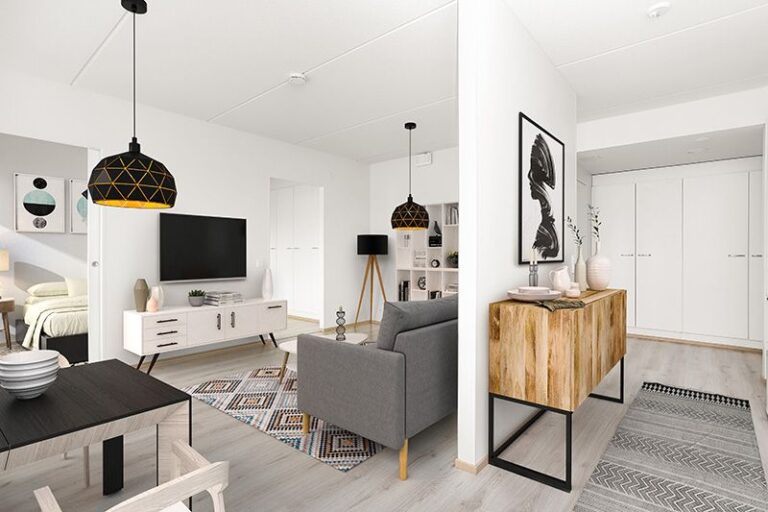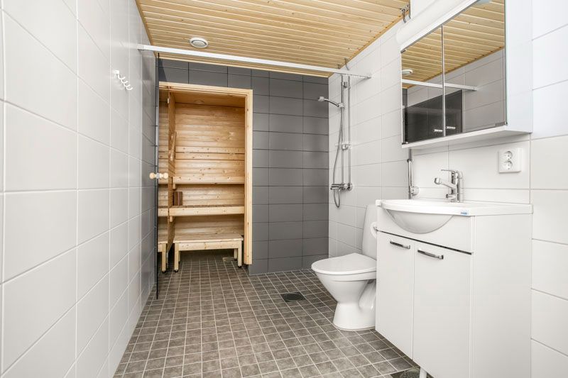 Ylimmän kerroksen valoisa kaksio hurmaa toimivalla pohjaratkaisullaan ja viihtyisällä tunnelmallaan. Avoin keittiö sulautuu saumattomasti ruokailu- ja olohuonetilaan, luoden tilavan ja kutsuvan kokonaisuuden niin arkeen kuin vapaa-aikaan. Makuuhuone tarjoaa erinomaiset säilytysratkaisut, ja asumismukavuutta nostavat oma sauna sekä suojaisa lasitettu parveke, jossa on helppo pysähtyä nauttimaan rauhasta ja näkymistä.