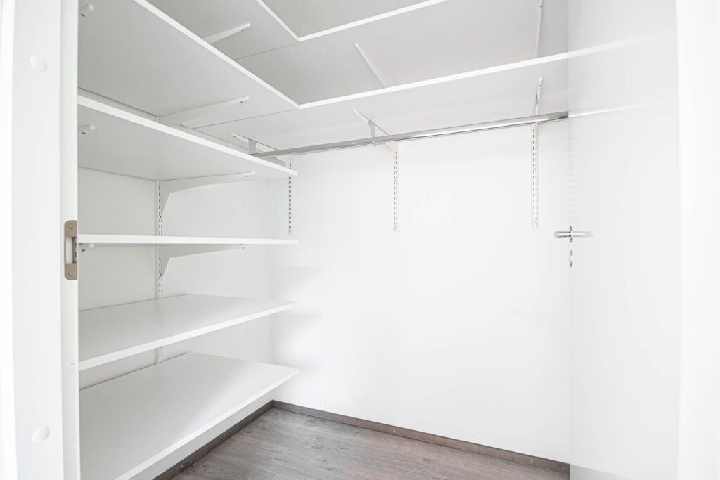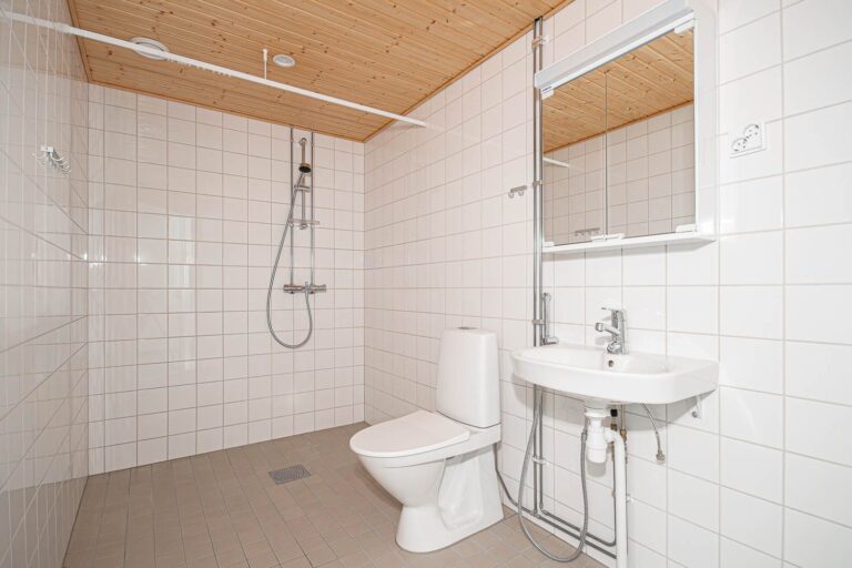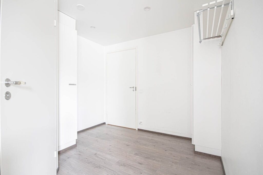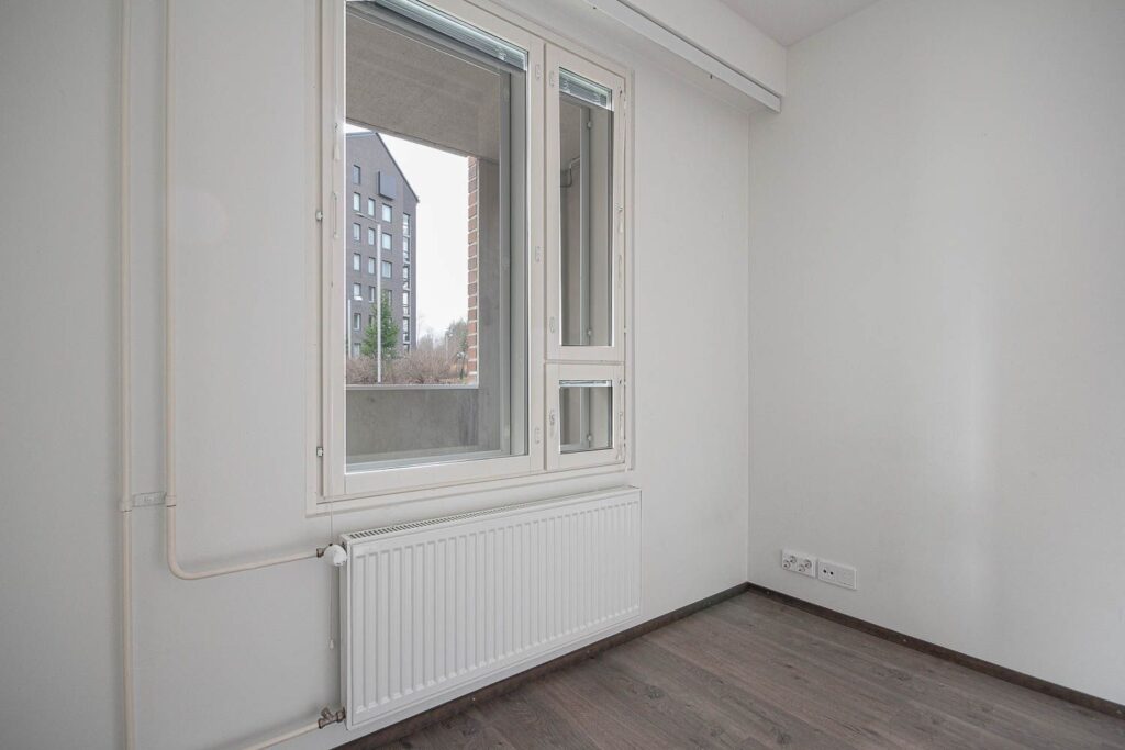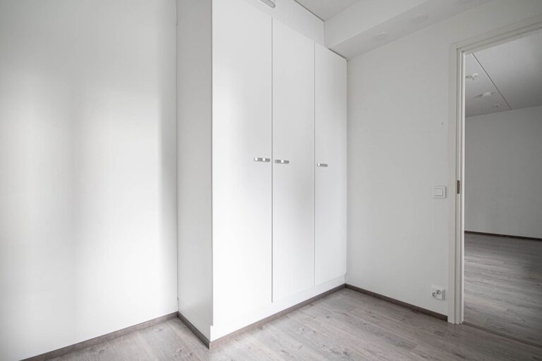 Kompakti kolmio talon alimmassa kerroksessa. Neliöt ovat käytetty tehokkaasti: yhtenäinen keittiö-/olohuonetila sekä kaksi makuuhuonetta, joista toisessa vaatehuone. Omaa saunaa tässä kodissa ei ole, mutta löylyistä pääsee halutessaan nauttimaan varaamalla saunavuoron talon yhteissaunasta.