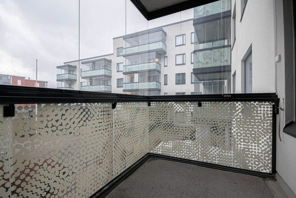Asunnossa on lasitettu parveke sisäpihan suuntaan.