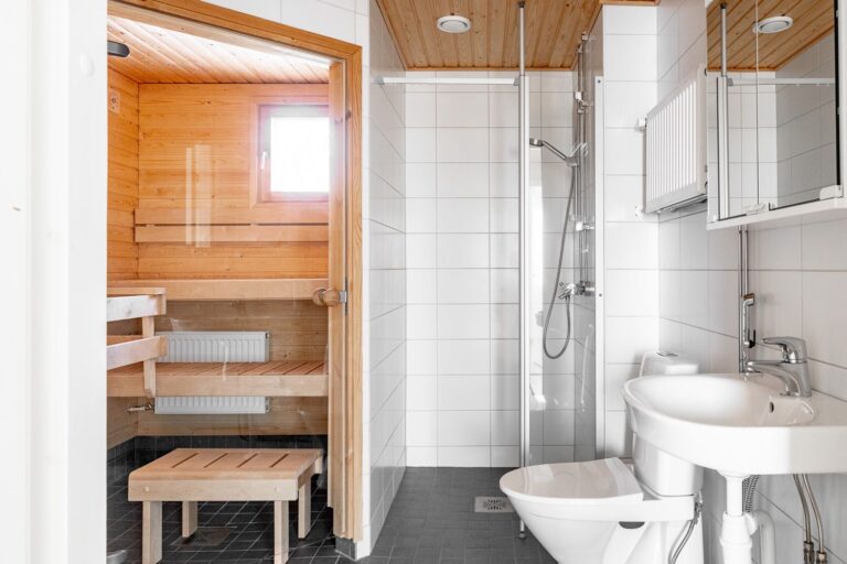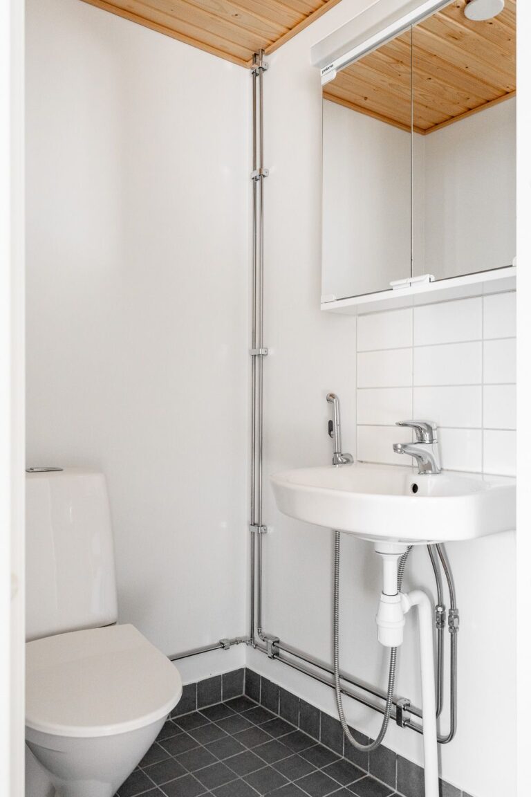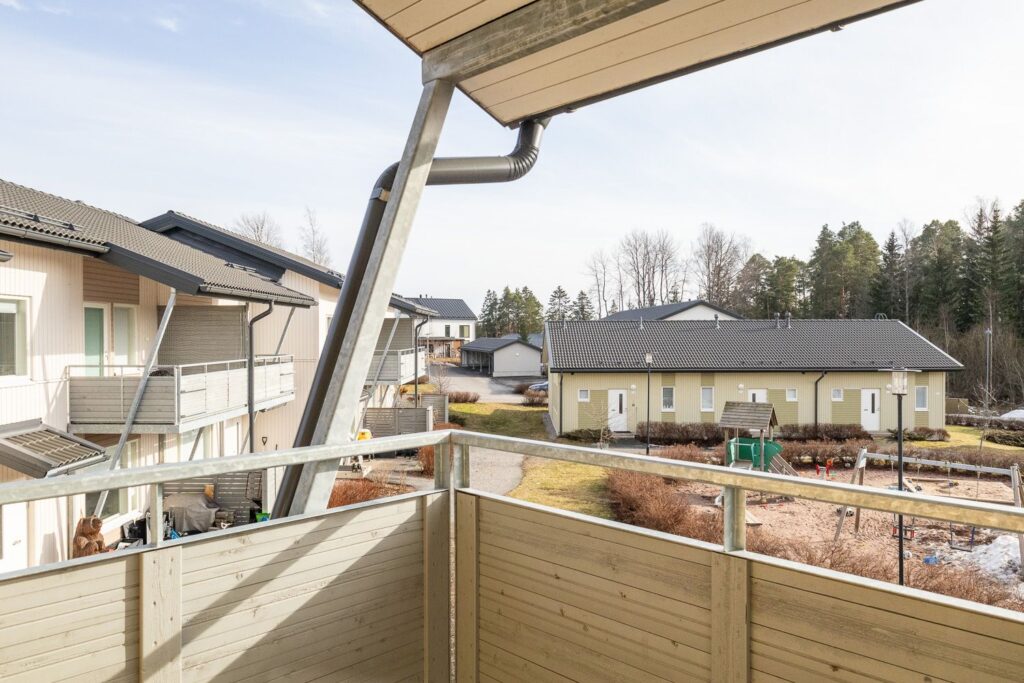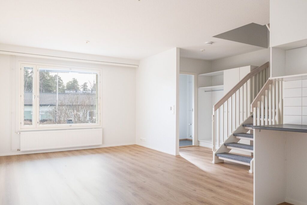 Käytännöllisen kaksitasoisen neliön pohja on toimiva, alakerrassa keittiö, joka yhdistyy luontevasti valoisaan olohuoneeseen. Yläkerrasta löytyvät makuuhuoneet sekä laatoitettu kylpyhuone ja oma sauna. Kaappitilaa löytyy reilusti eteisestä sekä makuuhuoneista.