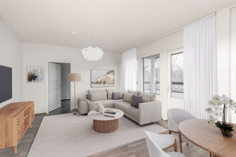 Vapaa ja tilava ylimmän kerroksen kolmio hissitalossa. Huoneistossa avara ja valoisa olohuone ja keittotila. Huoneiston makuuhuoneet omassa rauhassaan asunnon molemmissa päissä. Erillis-wc lisäämässä asumismukavuutta. Laatoitetussa, vaaleassa kylpyhuoneessa hyvin tilaa pesutornille. Lasitettu parveke länteen. Kuvat ovat vastaavanlaisella pohjaratkaisulla olevasta eri kerroksen asunnosta. Materiaalien sävyt ja varustelu voivat vaihdella.