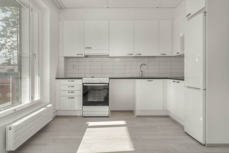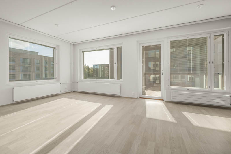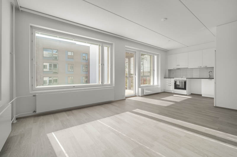 Hyväpohjainen ylimmän kerroksen kulmahuoneisto, johon tulee valoa kahdesta ilmansuunnasta. Avokeittiö ja olohuone muodostavat avaran kokonaisuuden, johon lisätilaa tuo lasitettu parveke. Lattiat ovat helppohoitoista laminaattia ja tilavassa kylpyhuoneessa on tyylikkäät laatoitetut seinät ja lattiat. Asumisviihtyvyyttä lisäävät sälekaihtimet ikkunoissa sekä oma sauna. Asunnon kuvat ovat vastaavasta, alemman kerroksen asunnosta.