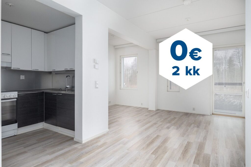 Tee sopimus nyt – saat kahden ensimmäisen kuukauden käyttövastikkeen hintaan 0 € ja vakuusmaksun 250 €. Edut ovat voimassa 15.4.2026 saakka ja koskevat vain vapaita asuntoja ja uusia asiakkaita. Vesi- ja autopaikkamaksut normaalisti. Edellyttää 12 kuukauden asumista.