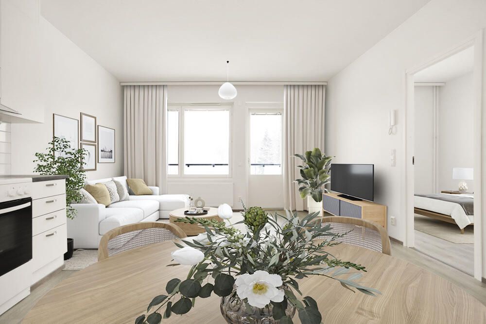 Kolmannen kerroksen kotoisa kaksio odottaa uusia asukkaitaan. Avokeittiö ja olohuone muodostavat viihtyisän kokonaisuuden, joka tarjoaa miellyttävän ympäristön niin yhdessäoloon kuin arjen askareisiin. Olohuoneesta on käynti tilavalle parvekkeelle, joka toimii kesäisin luontevana oleskelutilan jatkeena.