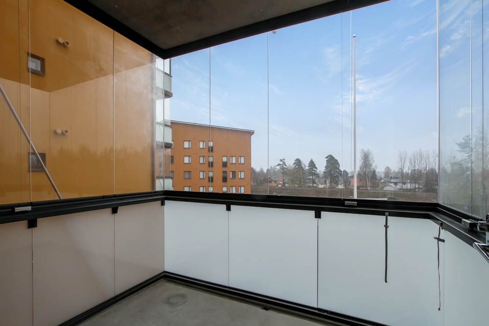 Lasitettu parveke toimii mukavana lisätilana keväästä syksyyn. Näkymä avautuu suojaisalle sisäpihalle, ja muutostyönä asennetut parvekekaihtimet tuovat tarvittaessa lisäsuojaa. Ilmoituksen kuvat ovat vastaavanlaisesta asunnosta, jossa pintamateriaalit ovat samat.