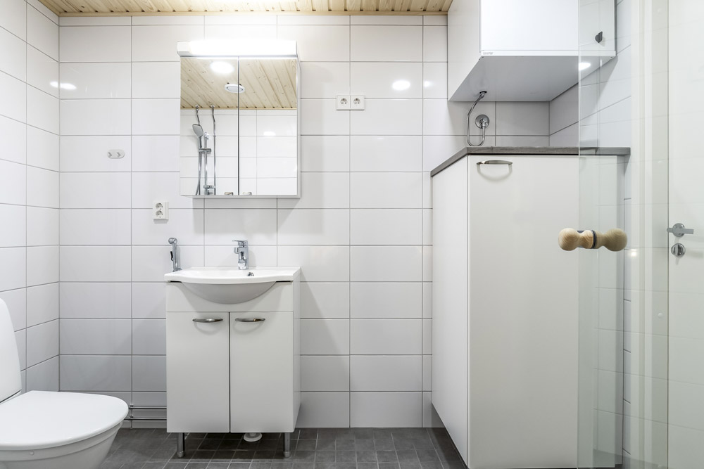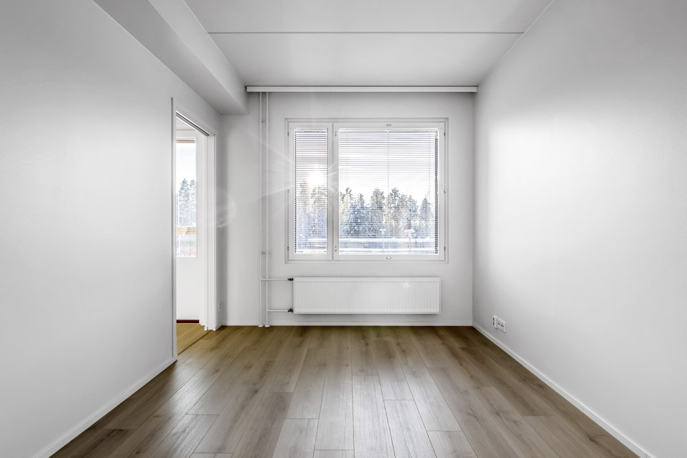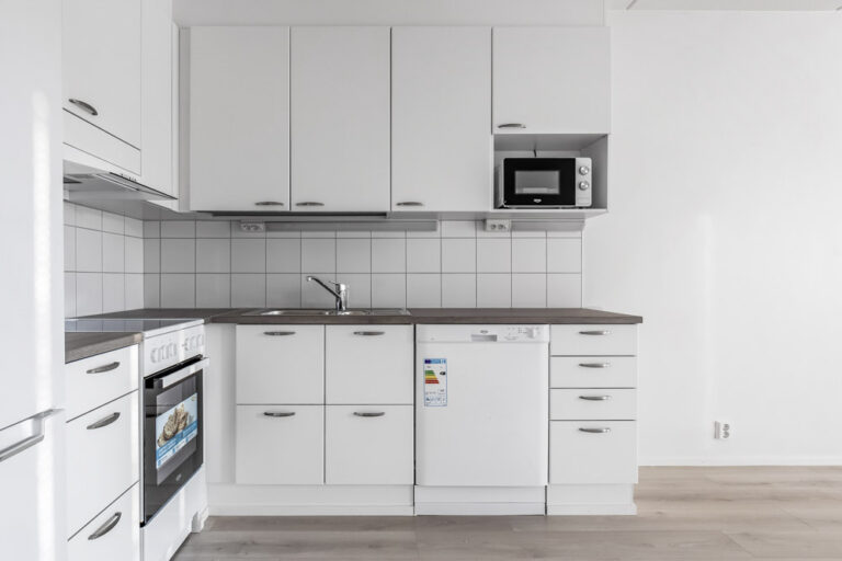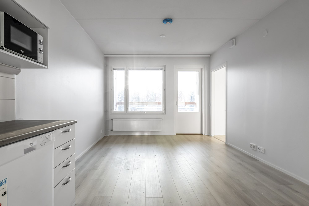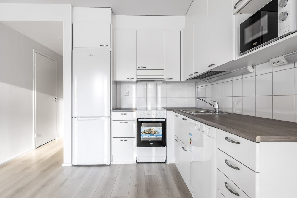 Tilava kaksio avaralla pohjaratkaisulla. Makuuhuoneen sekä eteisen yhteydessä on tilavat vaatekomerot, jotka tuovat reilusti säilytystilaa asuntoon. Makuuhuoneesta on myös käynti lasitetulle parvekkeelle, jossa voit vilvoitella oman saunan löylyjen jälkeen. Sisäkuvat otettu peilikuvana vastaavanlaisella pohjaratkaisulla varustetusta huoneistosta. Materiaalien sävyt saattavat poiketa toisistaan. Kuvien mikro ja astianpesukone eivät sisälly asunnon varusteisiin.