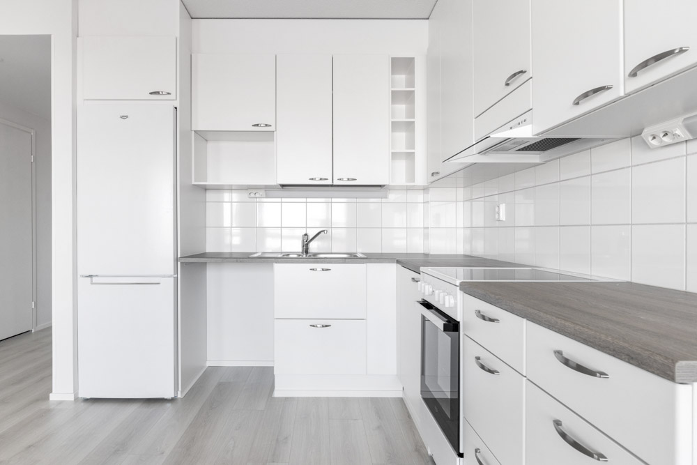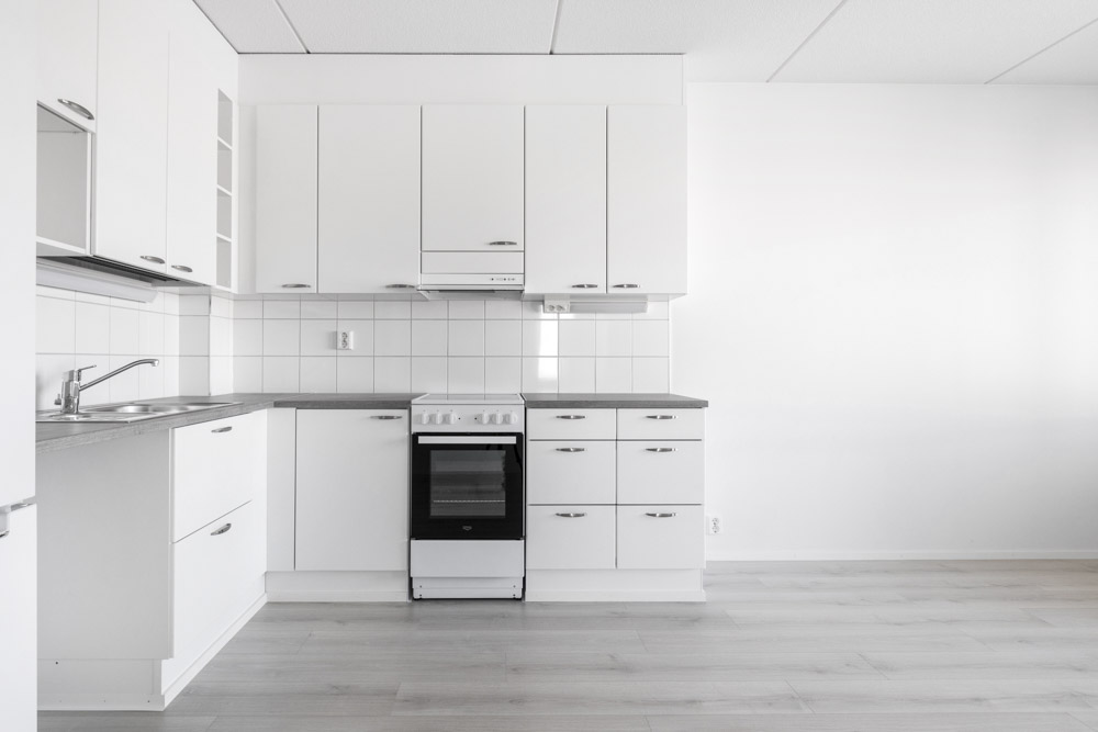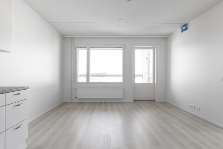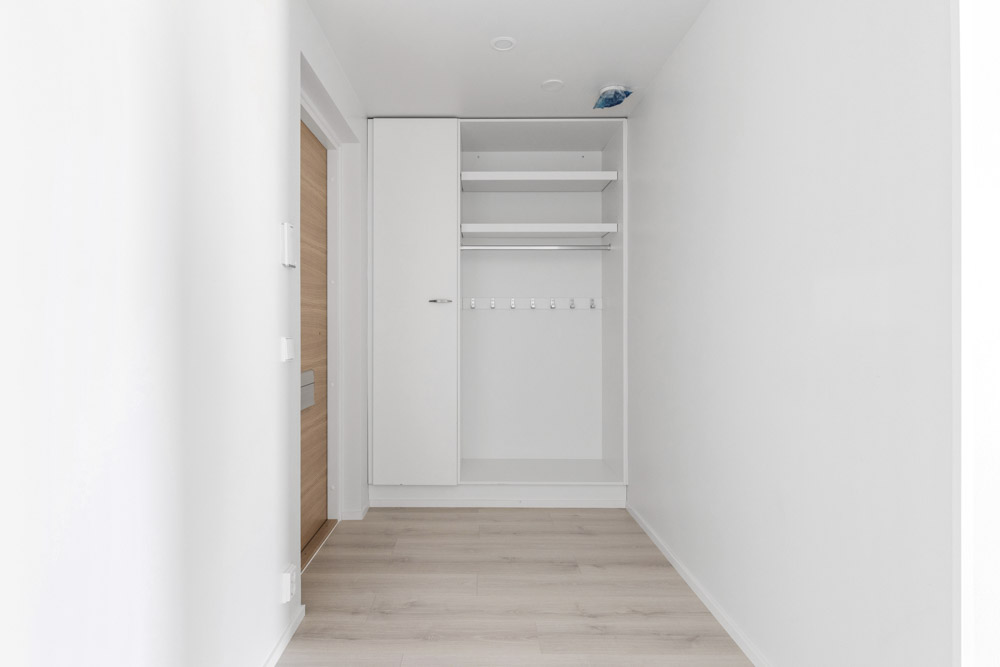 Tilava kulmakaksio avaralla pohjaratkaisulla. Makuuhuoneen yhteydessä on tilava vaatekomero, joka tuo reilusti säilytystilaa asuntoon. Olohuoneesta on käynti lasitetulle parvekkeelle, jossa voit vilvoitella oman saunan löylyjen jälkeen. Sisäkuvat otettu vastaanlaisella pohjaratkaisulla varustetusta huoneistosta. Materiaalien sävyt saattavat poiketa toisistaan.