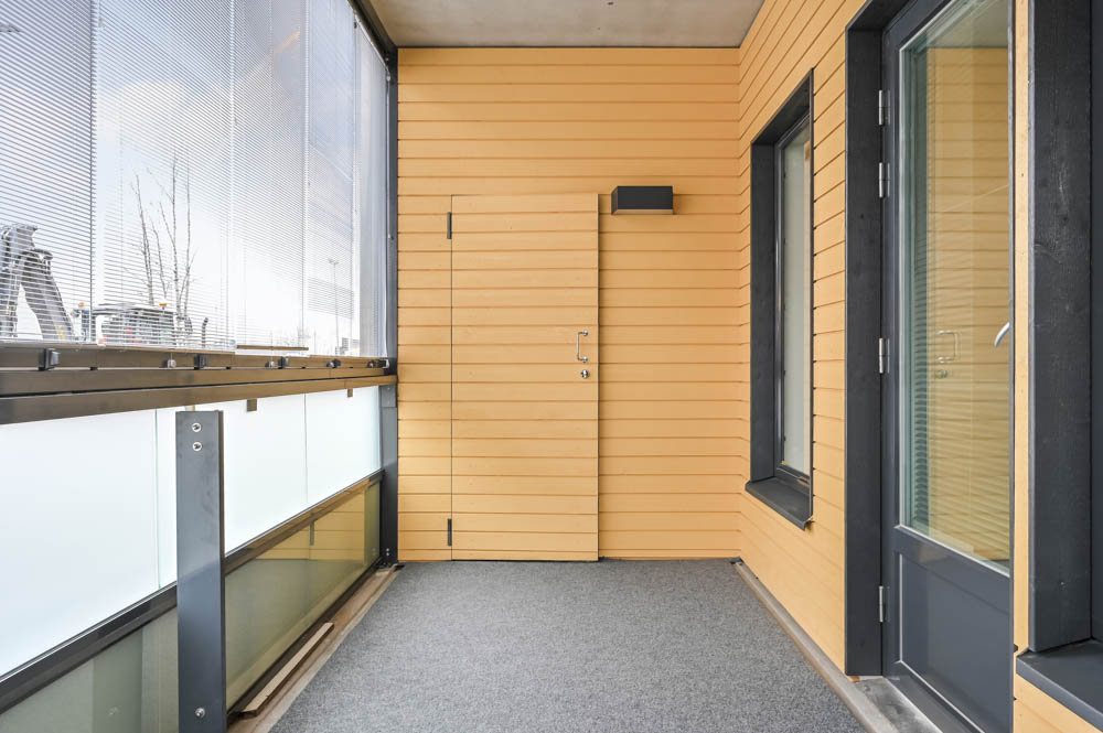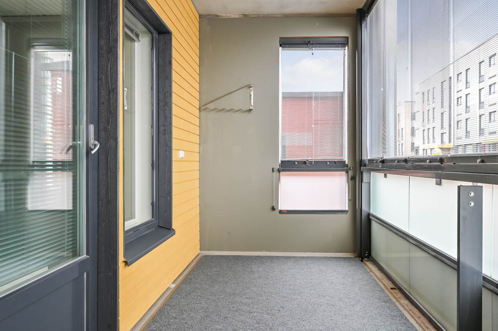 Olohuoneesta on käynti lasitetulle parvekkeelle, joka tuo lisätilaa asumiseen. Säilytysratkaisuja täydentää parvekkeella sijaitseva erillinen kylmävarastotila, joka helpottaa arjen järjestystä. Lisäksi asuntoon kuuluu myös erillinen lämmin varastotila.