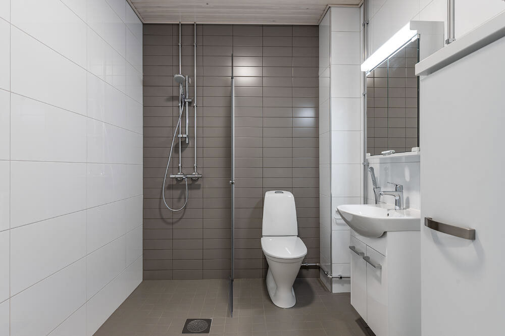 Käytännöllisesti suunniteltu makuuhuone tarjoaa hyvin tilaa ja säilytysratkaisuja arjen tarpeisiin. Kompakti kylpyhuone on selkeä ja toimiva kokonaisuus.