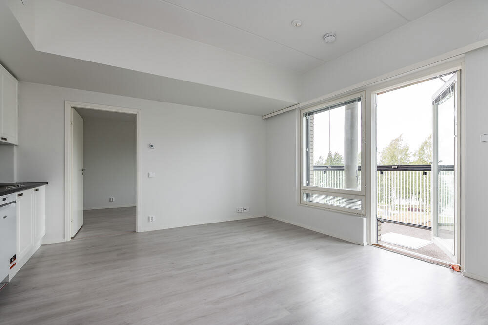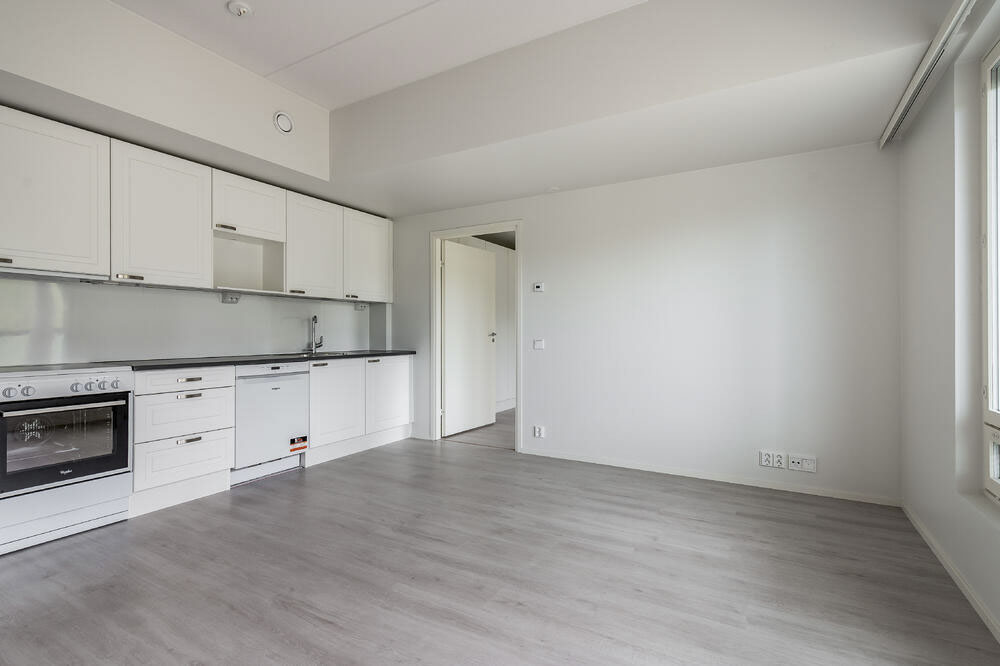 Keittiö ja olohuone muodostavat yhtenäisen ja avaran oleskelutilan, joka kutsuu viihtymään. Lasitettu parveke toimii monikäyttöisenä lisätilana niin oleskeluun kuin säilytykseen.