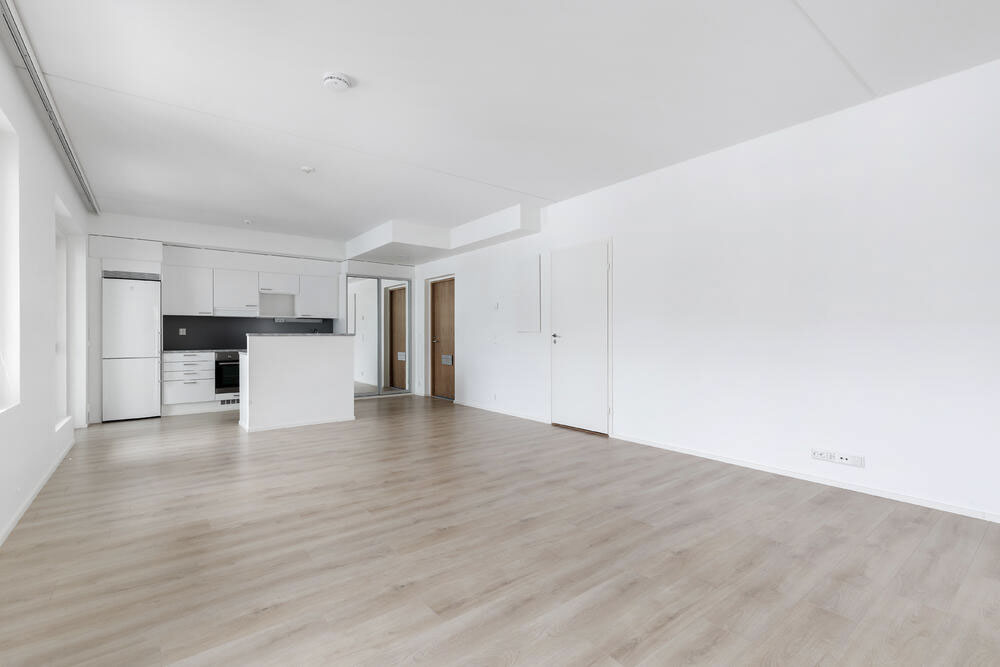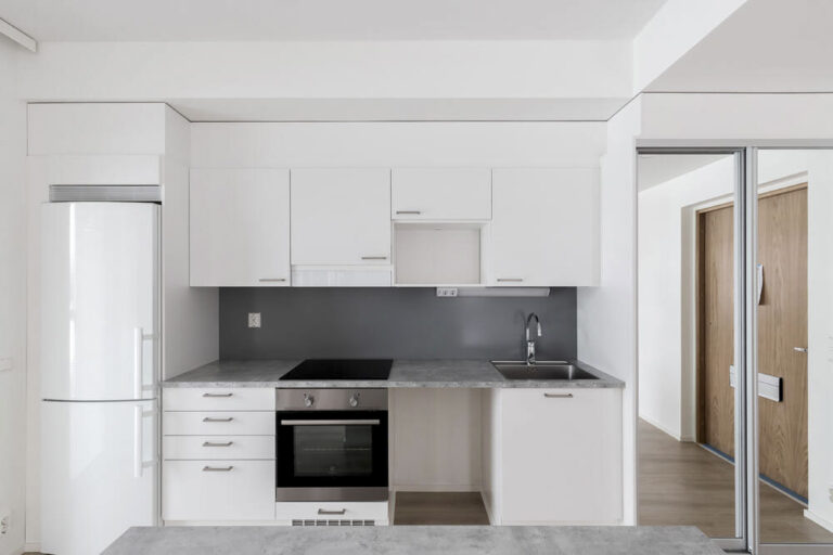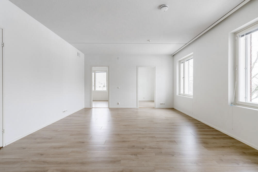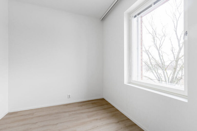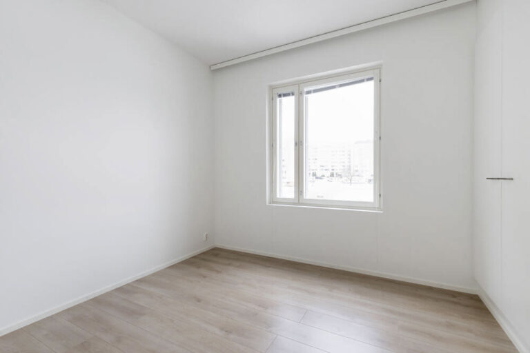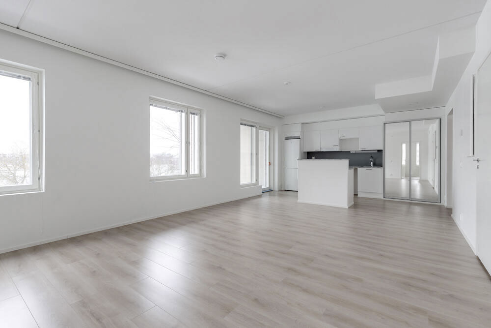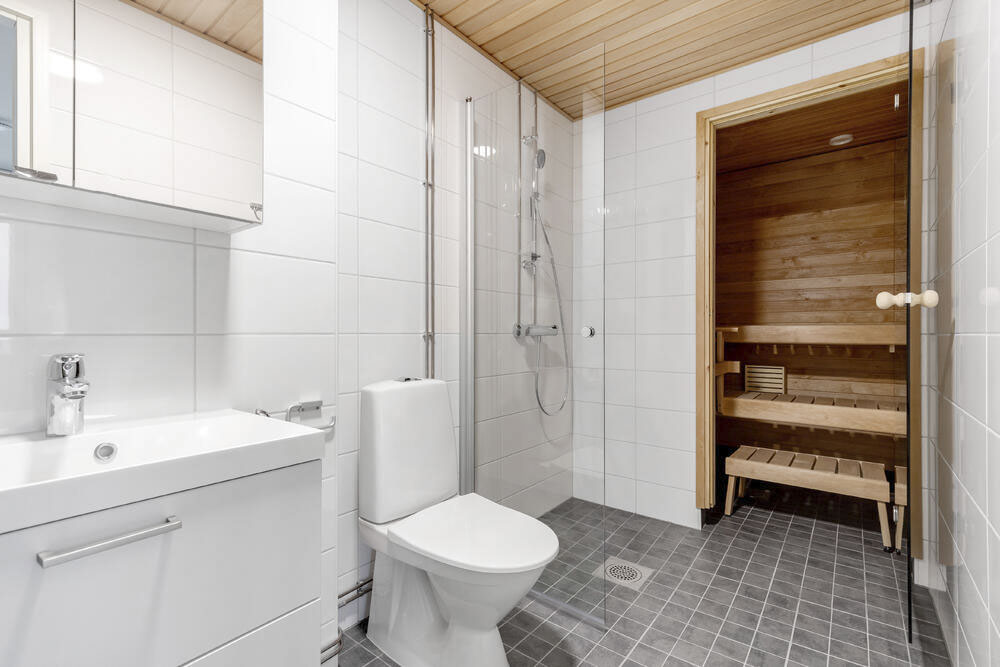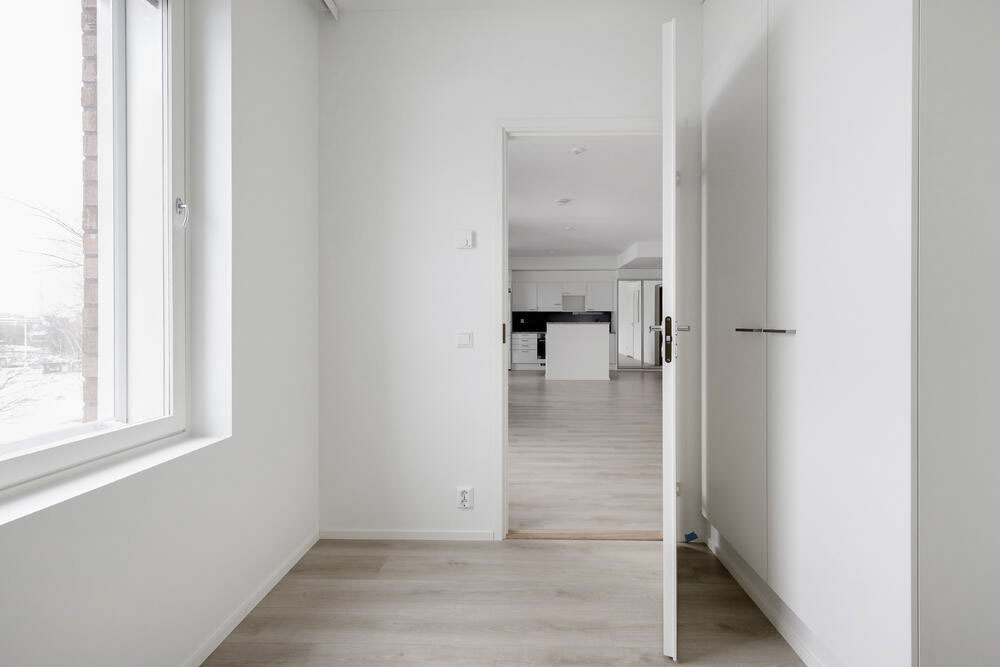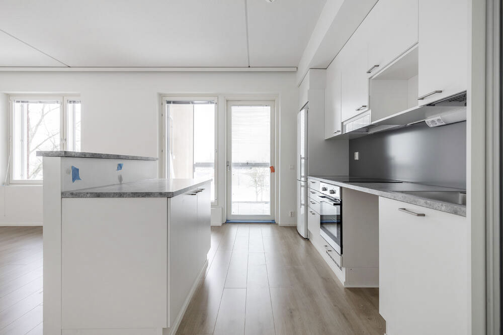 Asunnon sydän on avara ja yhtenäinen olohuone-keittiö-ruokailutila. Tämä tila on suunniteltu modernia asumista varten, ja suuret ikkunat tuovat tilaan runsaasti luonnonvaloa. Täältä on myös käynti parvekkeelle, joka on täydellinen paikka rentoutua. Lattia on vaaleaa laminaattia, joka tekee asunnosta valoisan ja avaran. Keittiön valkoiset kaapistot ja harmaat työtasot luovat modernin ja selkeän ilmeen. Asunnossa on kaksi erillistä makuuhuonetta, joissa molemmissa on kaappitilaa. Eteisessä on myös runsaasti kaappitilaa ulkovaatteille ja kengille. Kylpyhuone on tyylikkäästi laatoitettu, ja sen yhteydessä on oma sauna.