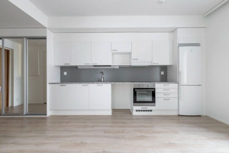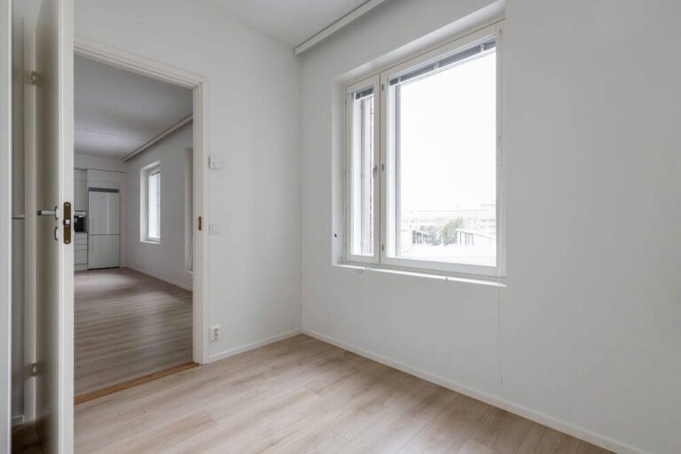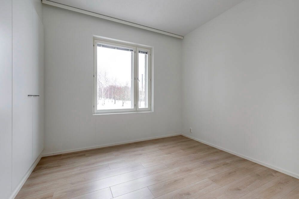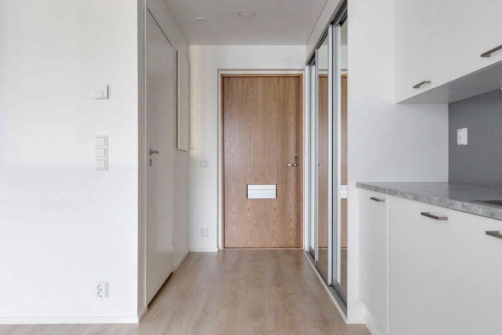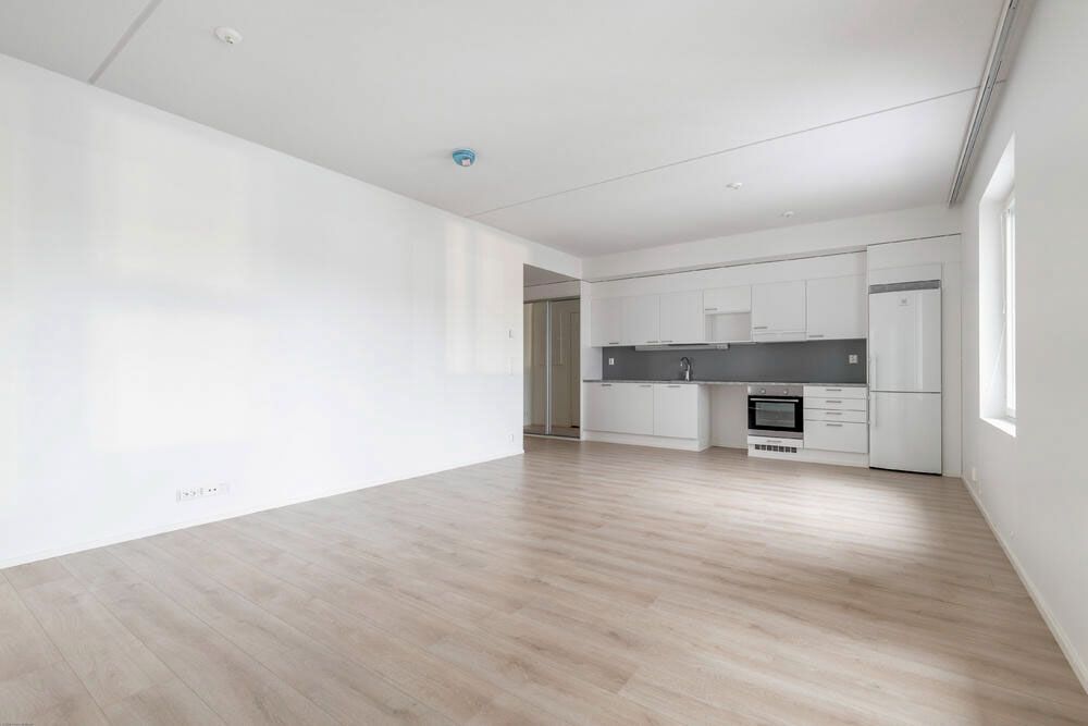 Kolmannen kerroksen asunto tarjoaa selkeän ja toimivan pohjaratkaisun, jossa neliöt on käytetty tehokkaasti. Eteisestä avautuu näkymä suoraan asunnon sydämeen, avaraan olohuoneeseen ja keittiöön. Keittiö on sijoitettu kätevästi seinustalle, jolloin ruokailutilalle ja oleskelulle jää hyvin tilaa. Asunnossa on kaksi makuuhuonetta, jotka soveltuvat niin perheen tarpeisiin kuin työtilaksi tai vierashuoneeksi. Olohuone jatkuu lasitetulle länsiparvekkeelle, jossa voi nauttia ilta-auringosta ja lisäoleskelutilasta ympäri vuoden. Kokonaisuus on valoisa, selkeälinjainen ja helposti sisustettava, mikä tekee tästä kodista viihtyisän ja toimivan.