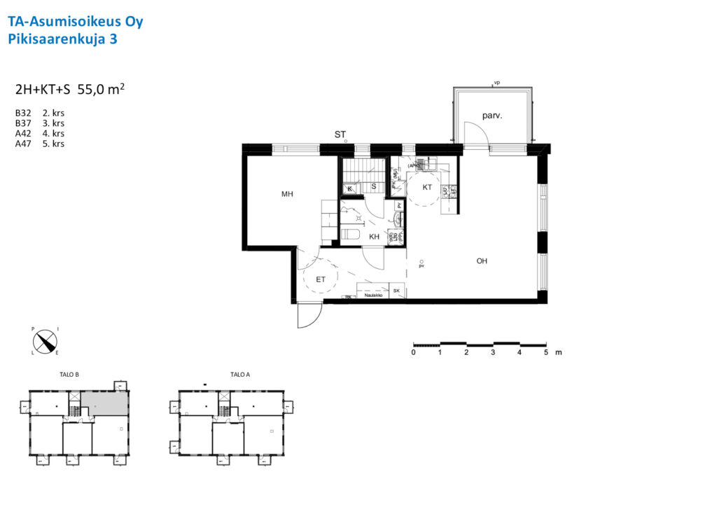 Tilava toisen kerroksen kaksio. Toimiva keittotila sujuvoittaa arjen ruoanlaittoa, ja ruokapöydälle löytyy luonteva paikka sen yhteydestä. Olohuone on avara ja valoisa, ja sieltä on käynti lasitetulle parvekkeelle. Säilytystilaa on eteisessä sekä makuuhuoneen kaapistossa. Ikkunat avautuvat koilliseen ja kaakkoon. Ilmoituksen kuvat ovat vastaavasta asunnosta.