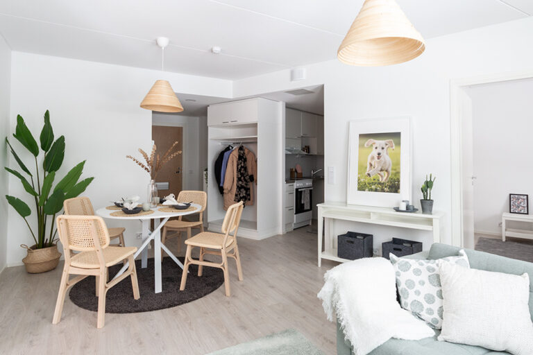 Asunnon käytännöllinen pohjaratkaisu tarjoaa kaksi wc-tilaa – toisen kylpyhuoneen yhteydessä ja toisen erillisenä, mikä tekee arjesta sujuvaa ja mukavaa.