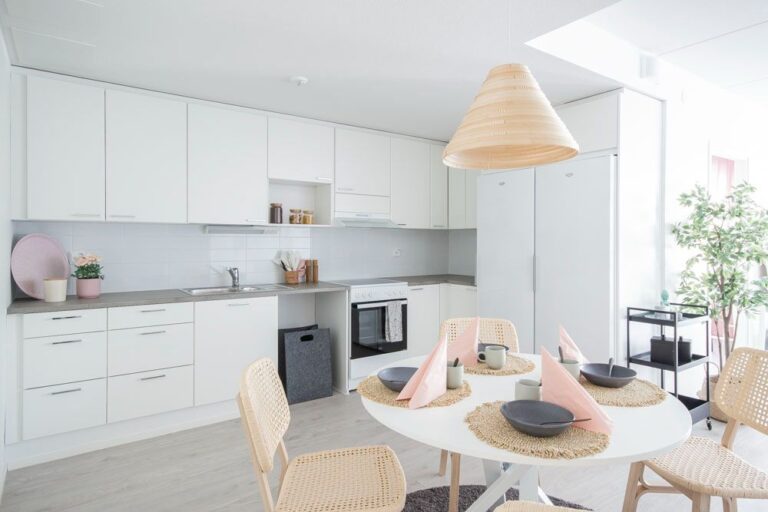 Neljännen kerroksen kolmio toimivalla pohjaratkaisulla. Tässä kodissa on tilava keittiötila, joka on hieman olohuoneesta erillään ja keittiötilaan mahtuu hyvin myös ruokapöytä. Säilytystiloja on sekä komeroiden että vaatehuoneen muodossa. Saunaa tässä kodissa ei ole, mutta halutessaan saunavuoron voi varata talon yhteissaunasta. Ilmoituksella näkyvät kuvat ovat pohjaratkaisultaan vastaavasta asunnosta.
