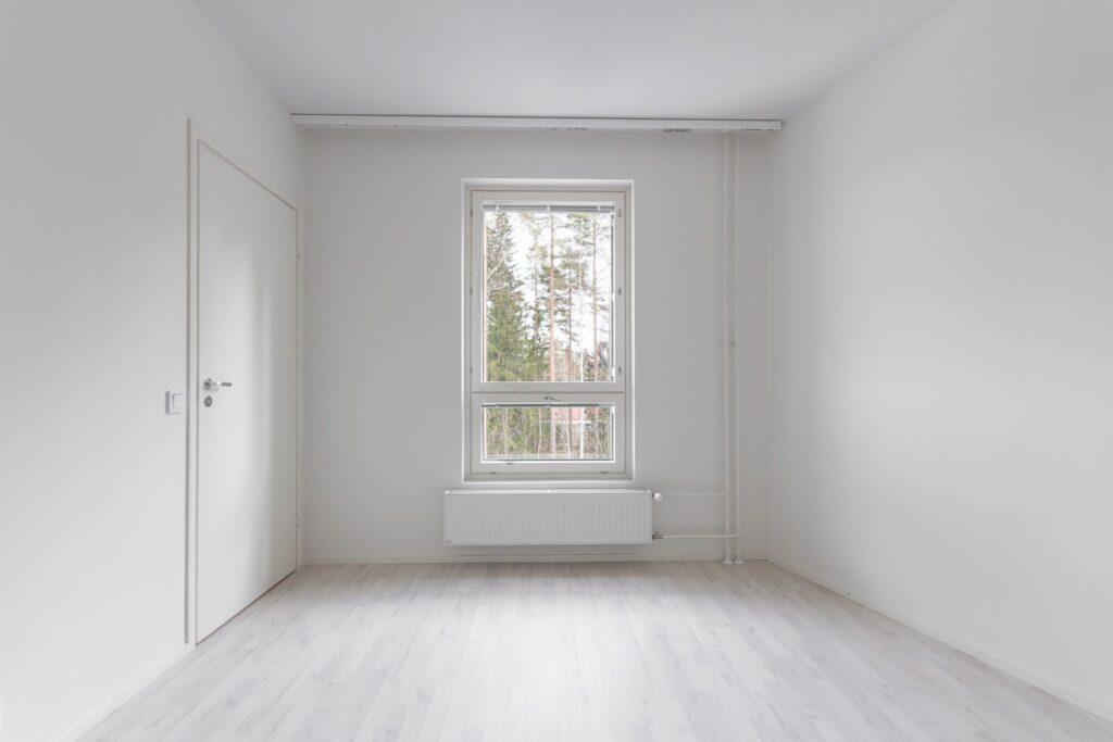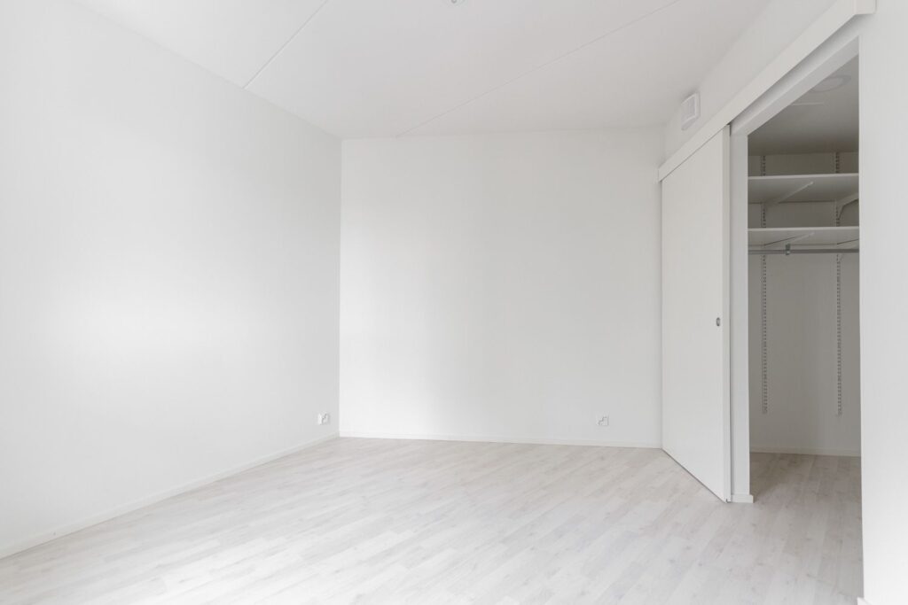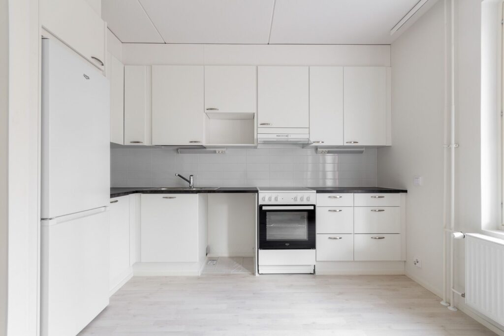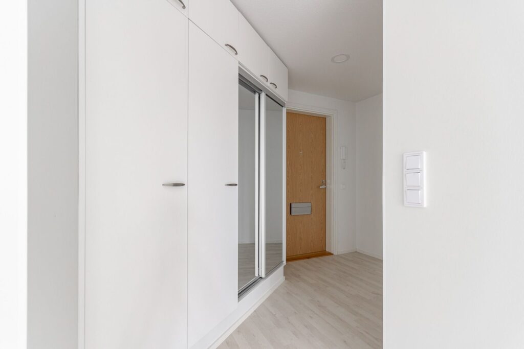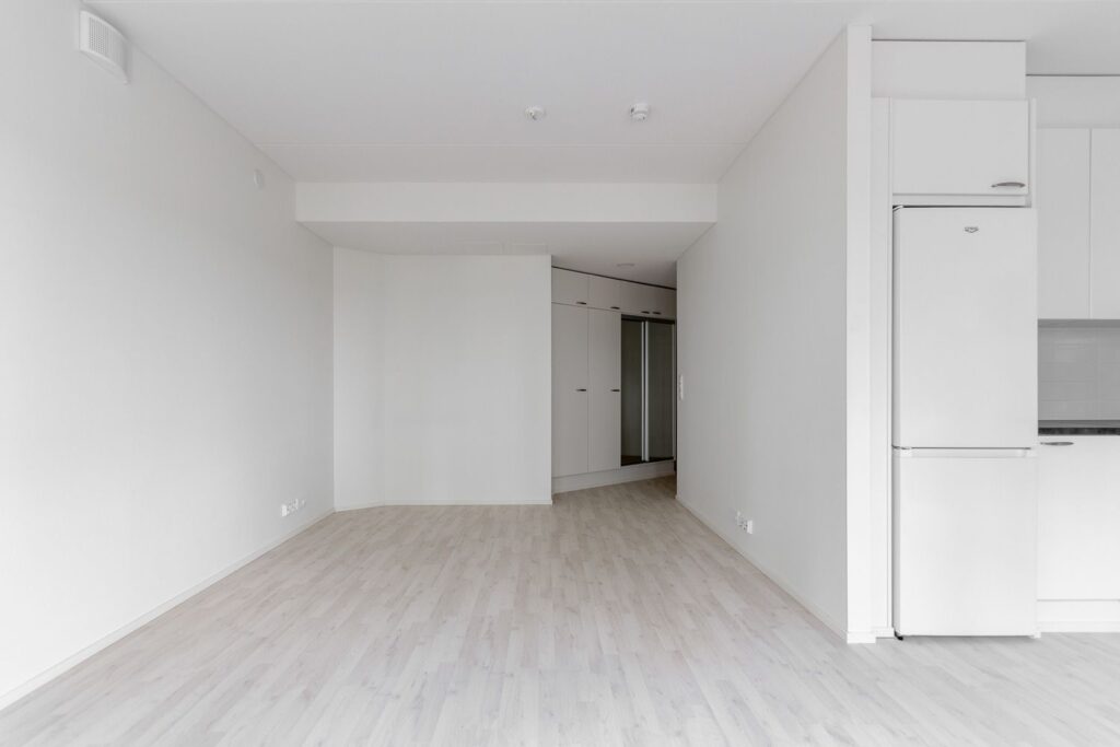Persoonallinen kaksio talon kulmauksessa – avara keittiö-olohuonetila ja veikeä vaatehuone