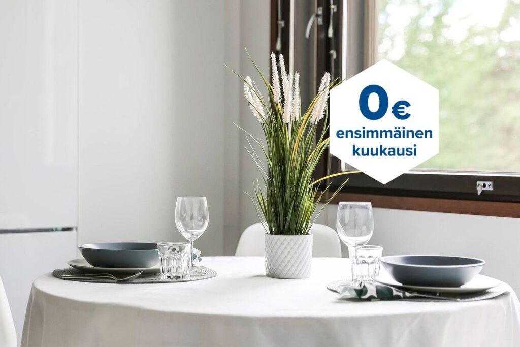 Tee sopimus nyt – saat ensimmäisen kuukauden käyttövastikkeen hintaan 0 €. Etu on voimassa 15.4.2026 saakka ja koskee uusia asiakkaita. Vesi- ja autopaikkamaksut normaalisti.
