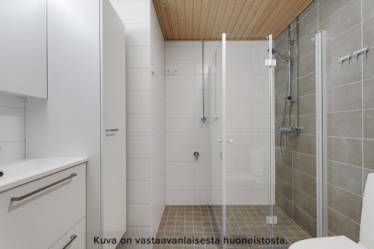 Kylpyhuoneessa on tilavaraus ja liitännät pyykinpesukoneelle ja kuivausrummulle sekä mukavasti säilytystilaa peili- ja allaskaapeissa sekä pyykkikaapissa. Asunnon ikkunoissa on sälekaihtimet lisäämässä yksityisyyttä. Kuvat ovat vastaavanlaisesta asunnosta ylemmästä kerroksesta.