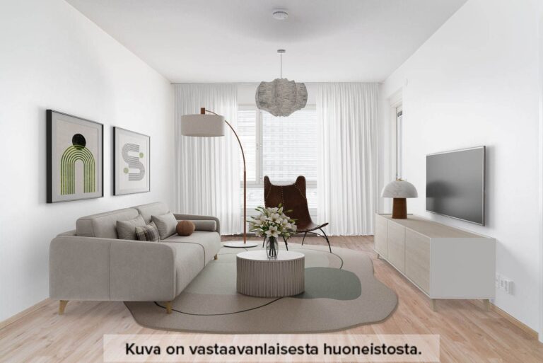 Asuntoon astutaan sisään eteiskäytävän kautta, jonka päädystä löytyy kylpyhuone. Avokeittiö avautuu tilavan olohuoneen yhteyteen muodostaen toimivan kokonaisuuden. Viihtyisästä olohuoneesta kuljetaan asunnon makuuhuoneeseen sekä parvekkeelle. Lasitettu parveke luo lisätilaa ja heijastaa valoa koko asuntoon.